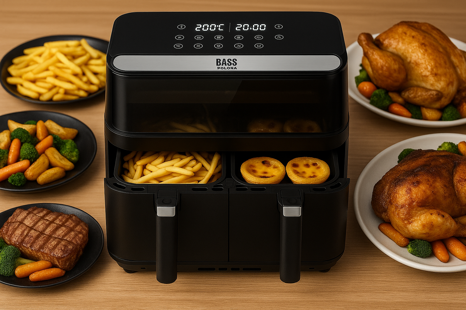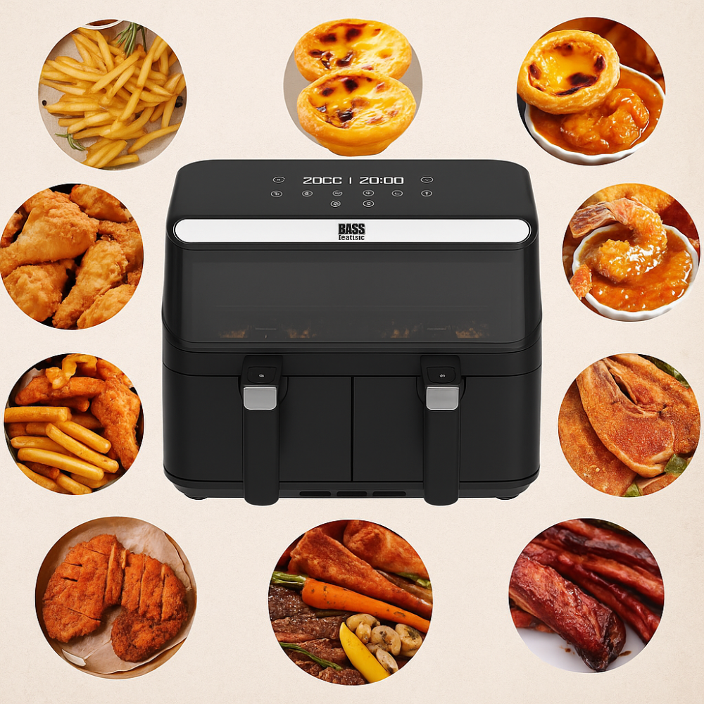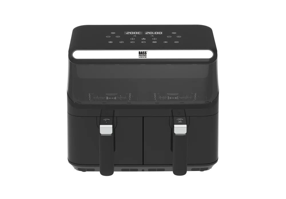 Urządzenie wyposażono w dwie osobne komory, które umożliwiają jednoczesne przygotowywanie dwóch różnych potraw w odmiennych temperaturach i czasie. Dzięki temu można równocześnie smażyć frytki i piec kurczaka, bez ryzyka przenikania smaków. To rozwiązanie, które znacznie zwiększa komfort i wydajność gotowania – idealne dla rodzin oraz osób, które cenią oszczędność czasu.
