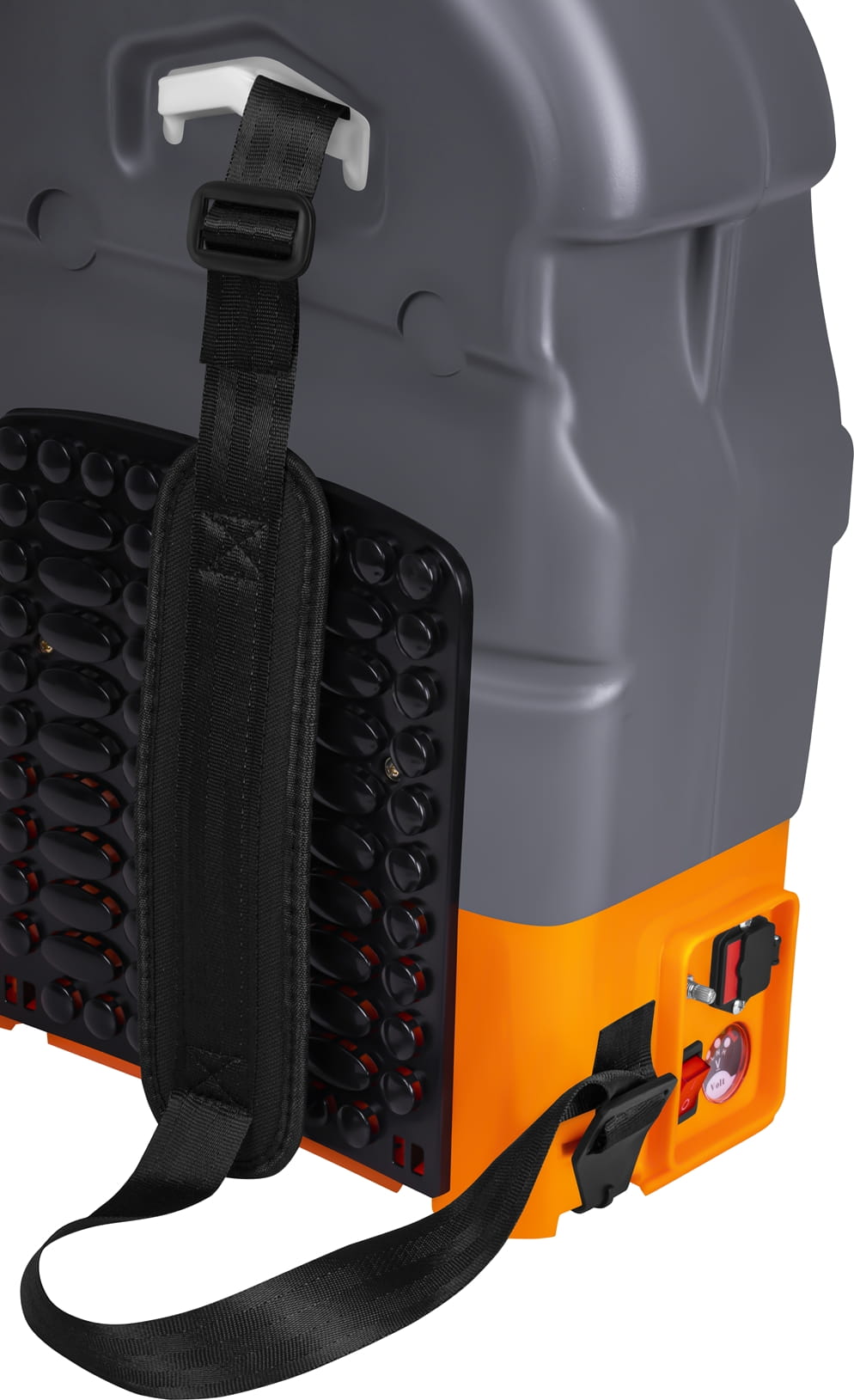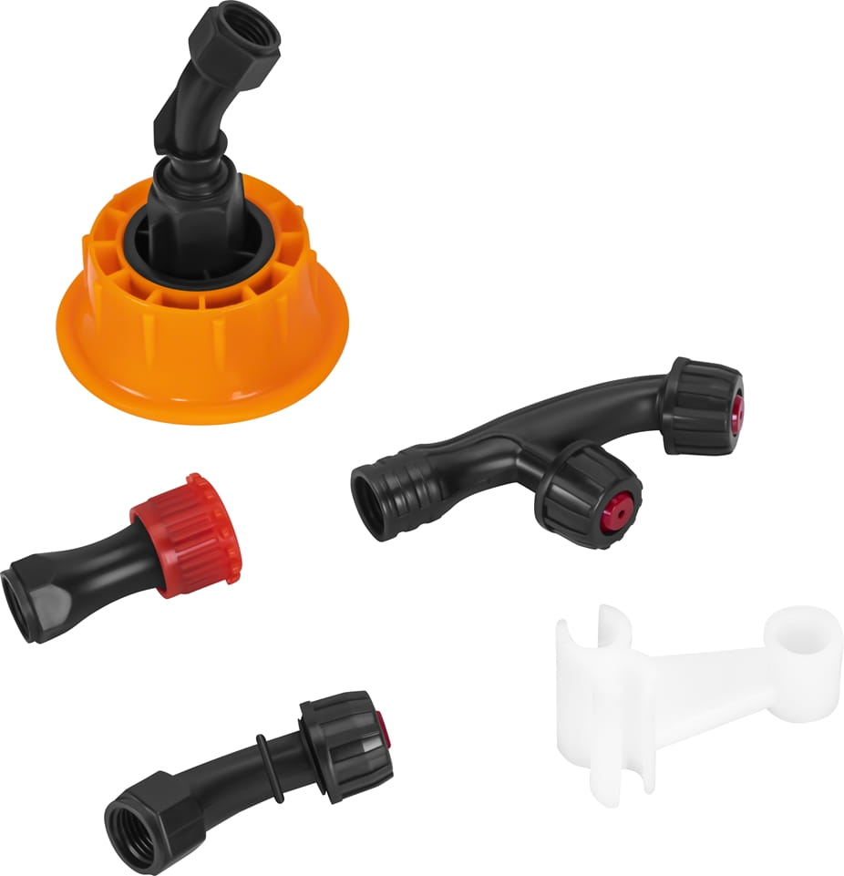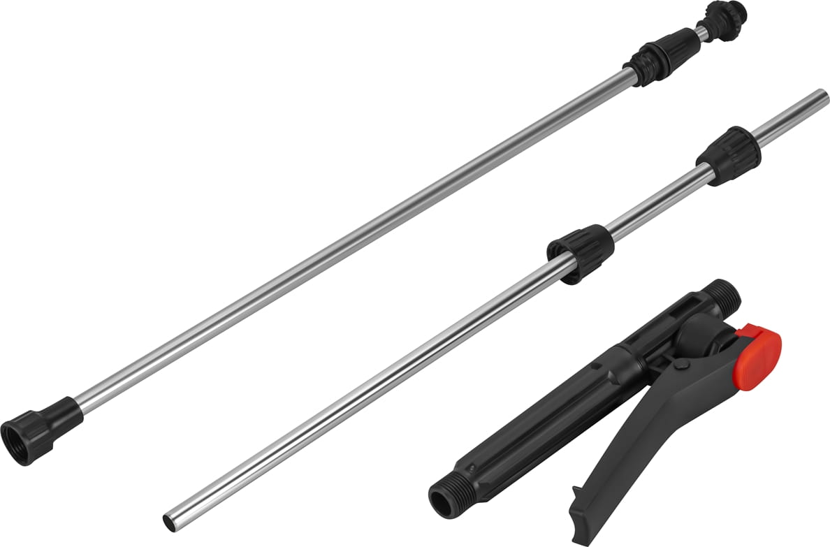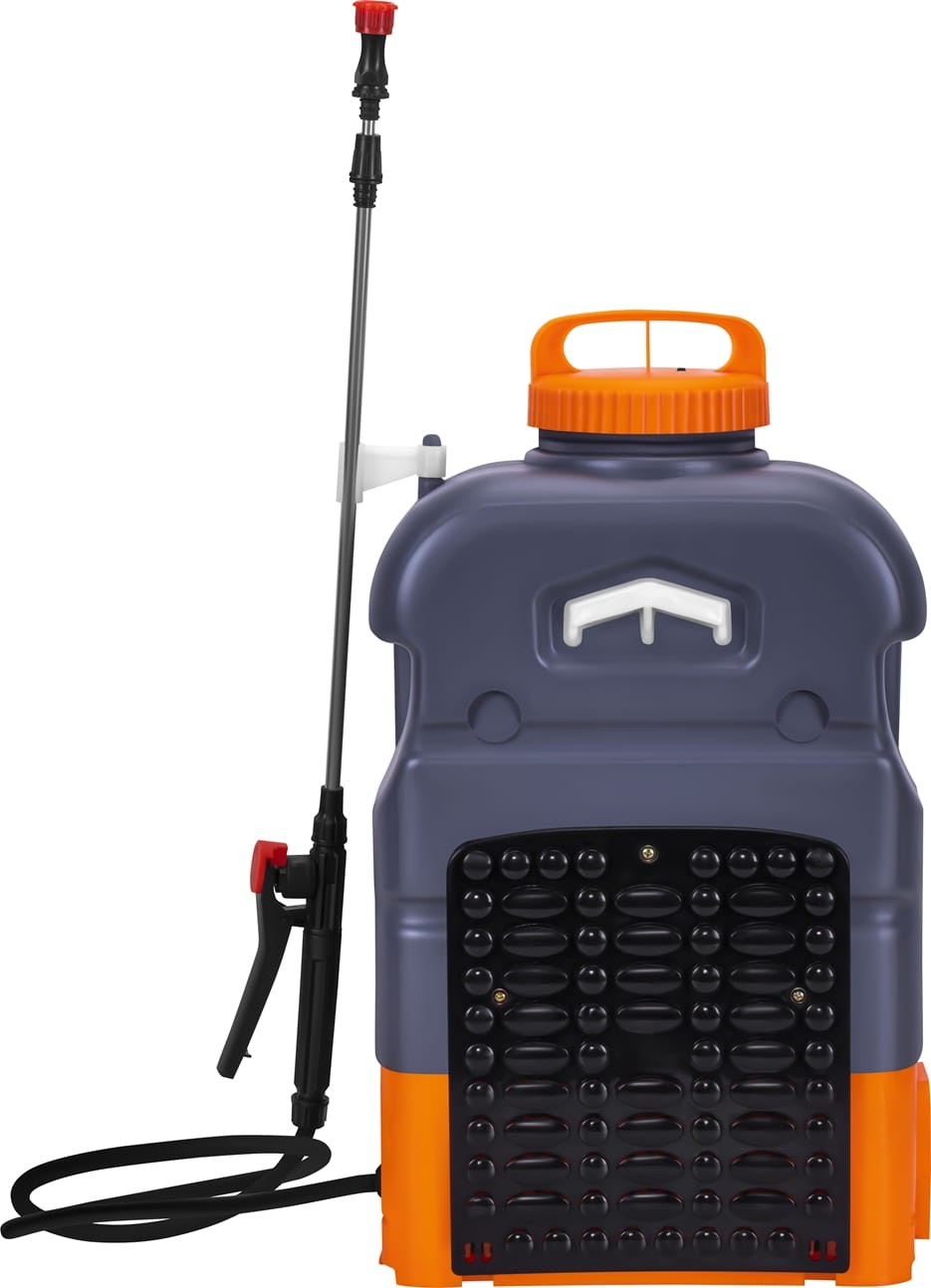 Konstrukcja opryskiwacza została zaprojektowana z myślą o wygodzie i trwałości. Dwa regulowane paski nośne umożliwiają noszenie urządzenia na plecach, co równomiernie rozkłada ciężar i zwiększa komfort podczas długotrwałej pracy. Ergonomiczny uchwyt na cztery palce zapewnia pewny chwyt i lepszą kontrolę nad strumieniem cieczy. Dodatkowo uchwyt na lancę ułatwia jej przechowywanie oraz transport, minimalizując ryzyko uszkodzeń.