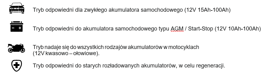 - Obsługiwane typy akumulatorów: samochodowe, motocyklowe, AGM (z systemem START-STOP)