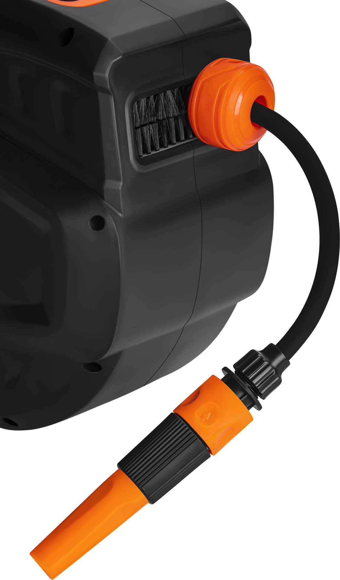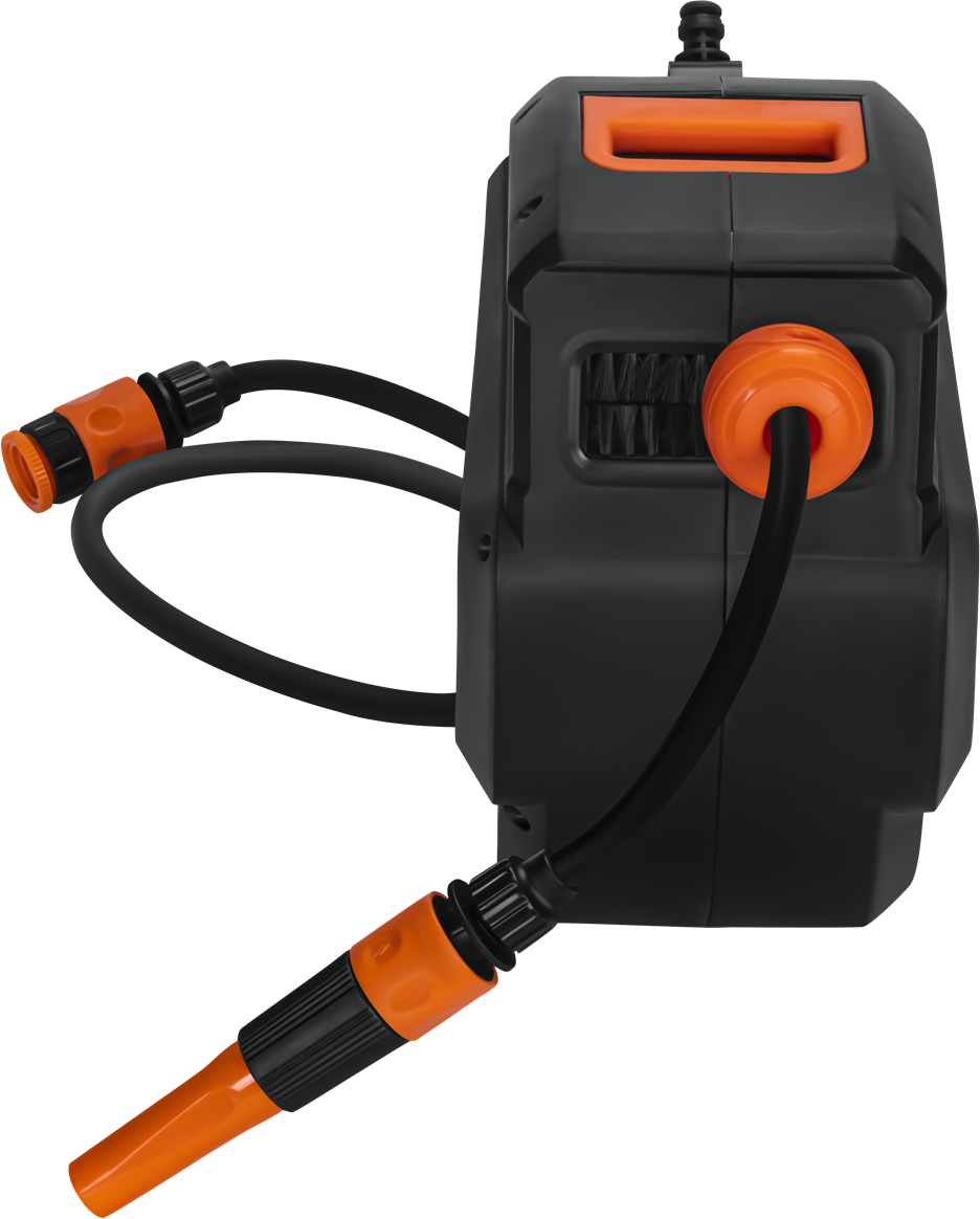 Obudowa wykonana z trwałego tworzywa chroni wąż oraz mechanizm zwijania przed uszkodzeniami mechanicznymi i wpływem warunków atmosferycznych. Obrotowy uchwyt umożliwia swobodne prowadzenie węża w różnych kierunkach, co zmniejsza naprężenia i poprawia komfort użytkowania. Mechanizm prowadnicy zapobiega skręcaniu przewodu, co wydłuża jego żywotność.