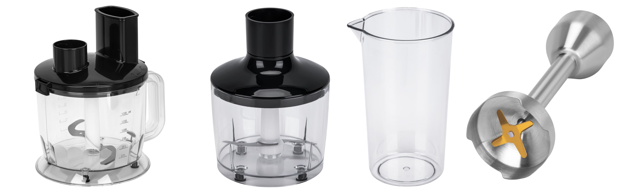 - Bogaty zestaw akcesoriów – umożliwia siekanie, ubijanie, szatkowanie, mielenie, wyrabianie ciasta i wiele innych czynności kuchennych.