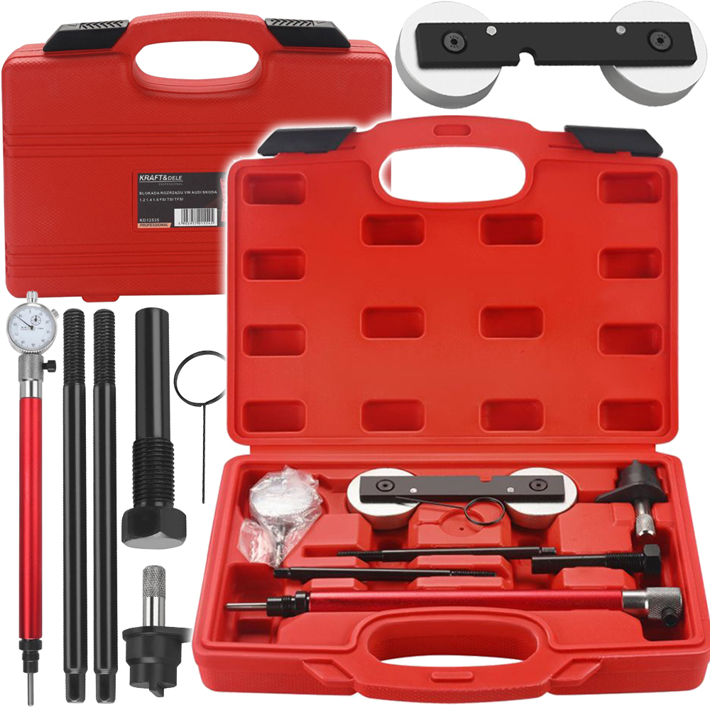W komplecie znajdują się między innymi czujnik zegarowy z uchwytem, narzędzia do ustawiania wałka rozrządu oraz trzpienie blokujące, które umożliwiają precyzyjne i bezpieczne wykonywanie czynności serwisowych. Całość stanowi profesjonalne wsparcie dla warsztatów samochodowych i mechaników zajmujących się obsługą silników grupy VAG.