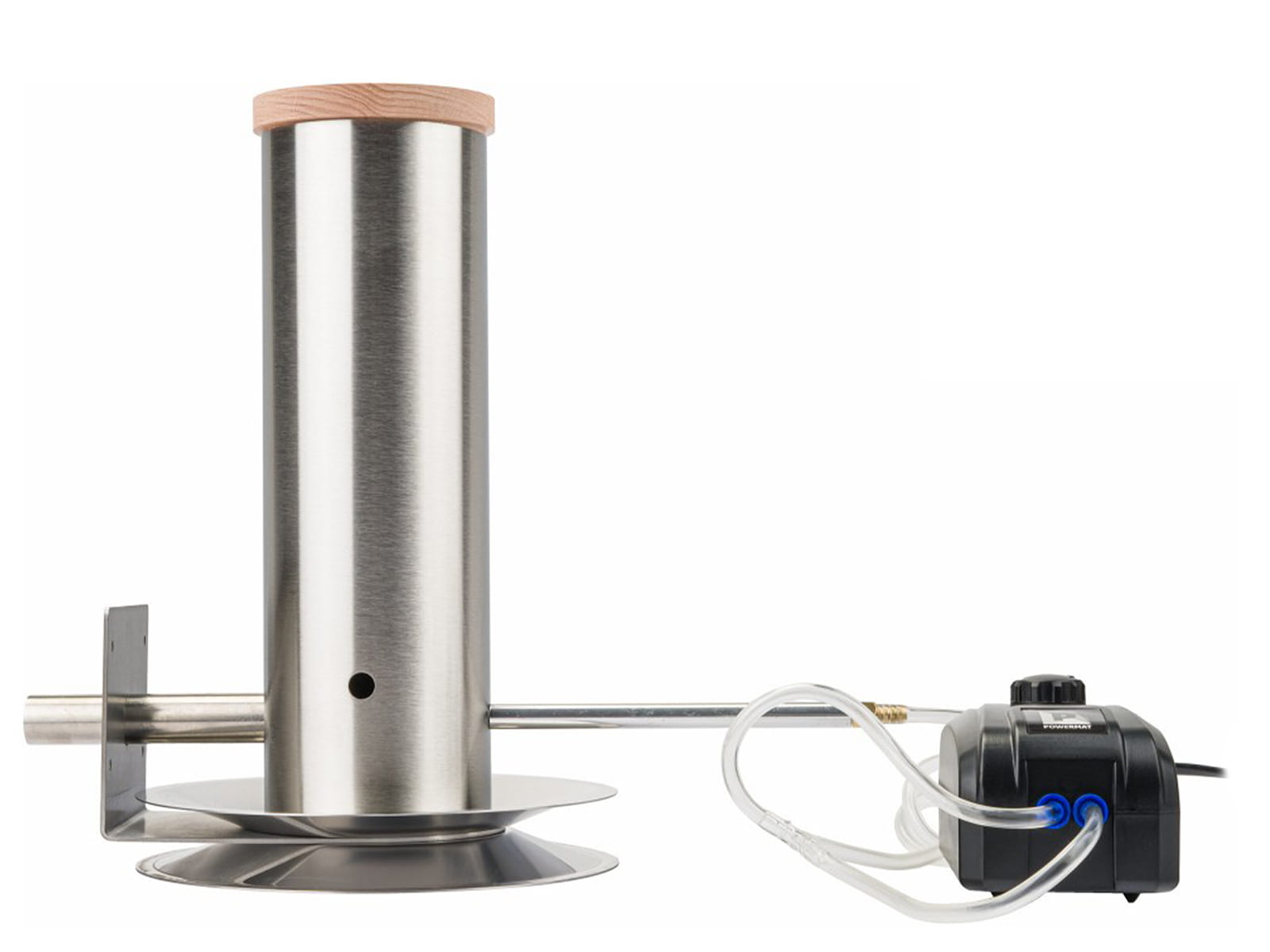 Precyzyjne ustawienie ilości produkowanego dymu pozwala na uniknięcie nadmiernego zakwaszenia produktów. Pompa jest podłączona poprzez wężyk do specjalnej, zintegrowanej rurki, przez którą jest dostarczane powietrze. Rurka pełni również funkcję konstrukcyjną - wchodzi w odpowiednie wycięcie w podstawie, zapewniając idealne ustawienie dyszy względem wędzarni i korpusu generatora.