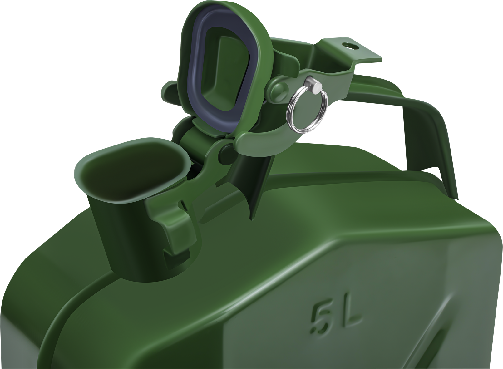 Zastosowany system zamknięcia stabilizuje pokrywę i zapobiega wyciekom podczas przewożenia kanistra. Rozwiązanie to zwiększa bezpieczeństwo użytkowania zarówno w samochodzie, jak i podczas transportu ręcznego.