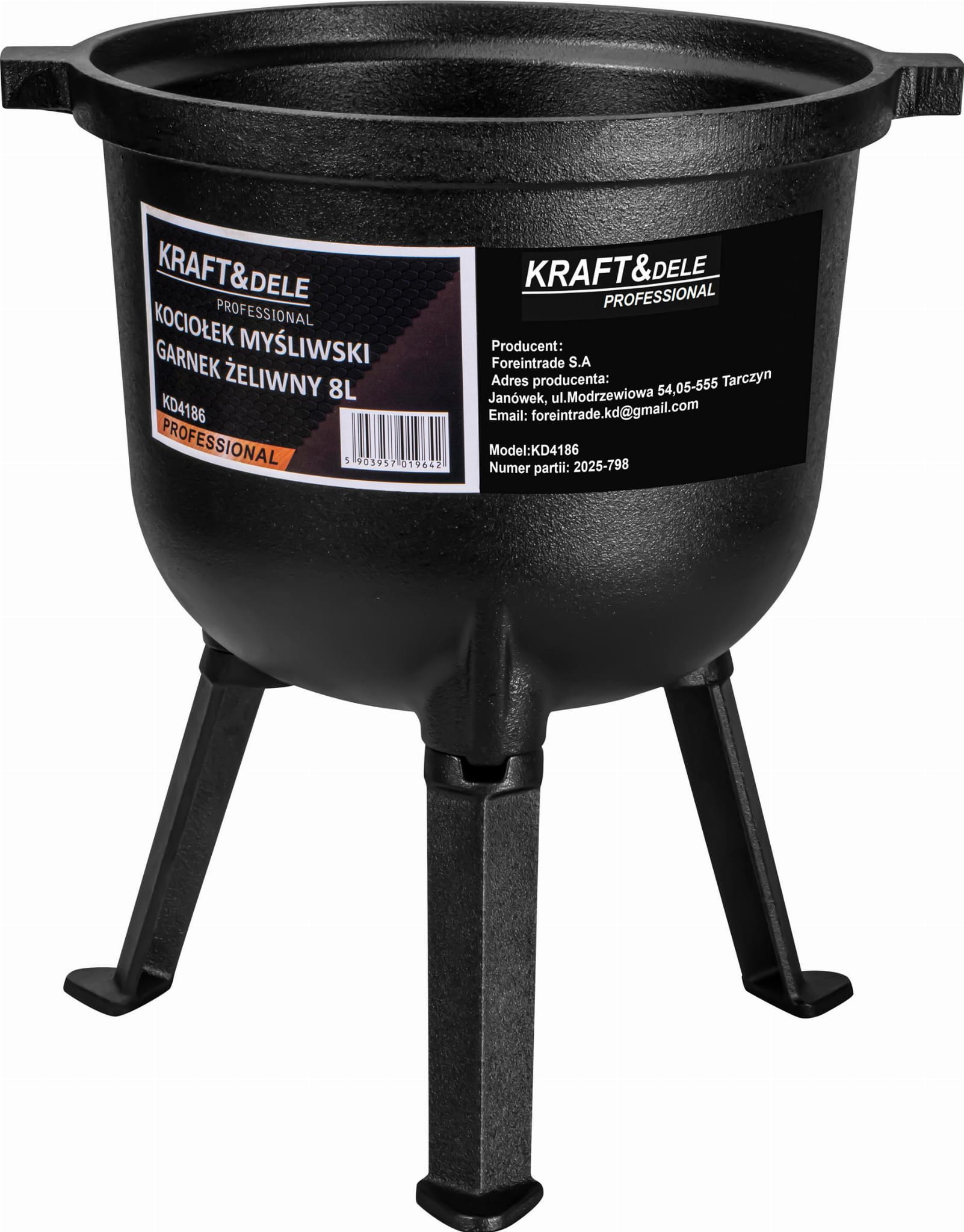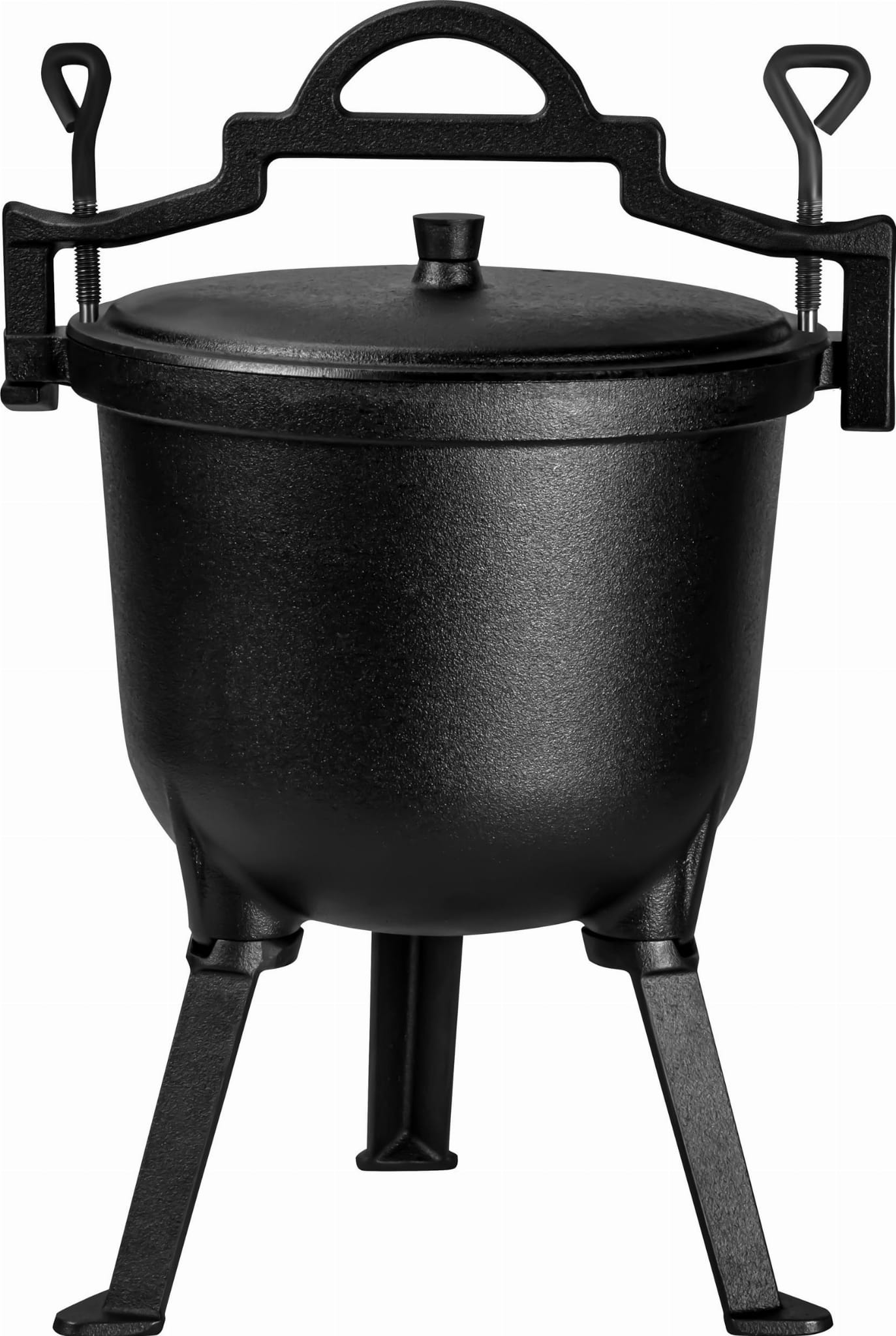 Odlew żeliwny zapewnia wysoką trwałość oraz odporność na uszkodzenia mechaniczne i działanie wysokich temperatur. Stabilny, odkręcany trójnóg umożliwia bezpieczne ustawienie kociołka bezpośrednio w żarze lub nad paleniskiem. Konstrukcja umożliwia łatwe składanie i transport urządzenia, co ułatwia użytkowanie w terenie.
