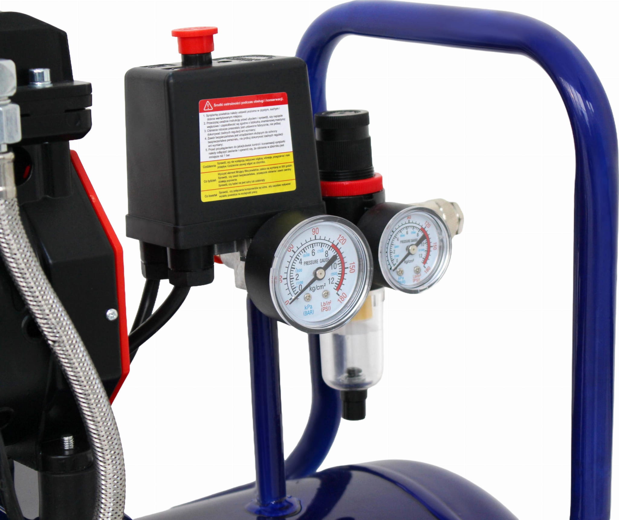 - Dwa czytelne manometry – Umożliwiają bieżącą kontrolę ciśnienia w zbiorniku oraz ciśnienia wyjściowego.