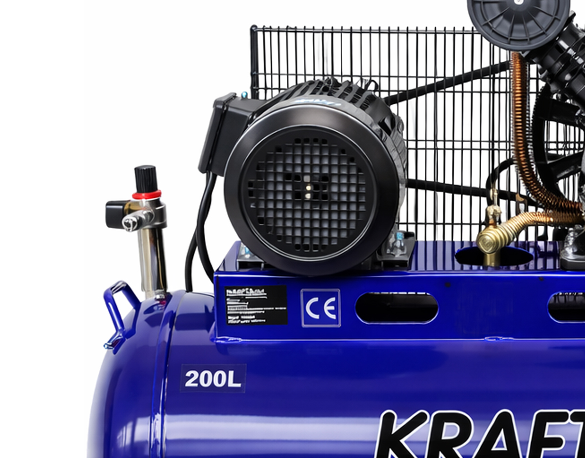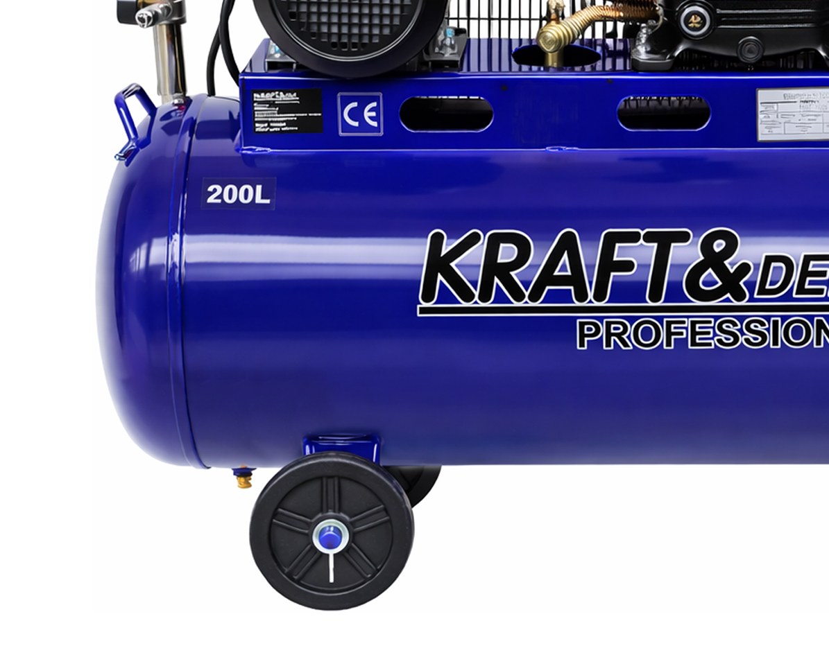 - Duża pojemność zbiornika – zbiornik 200 L umożliwia długą i stabilną pracę bez częstego dobijania powietrza