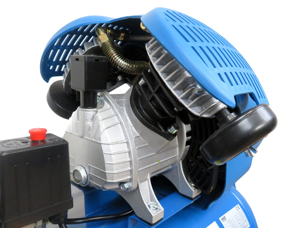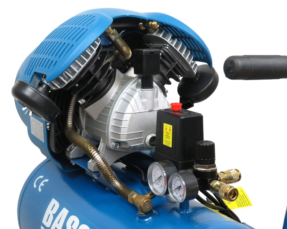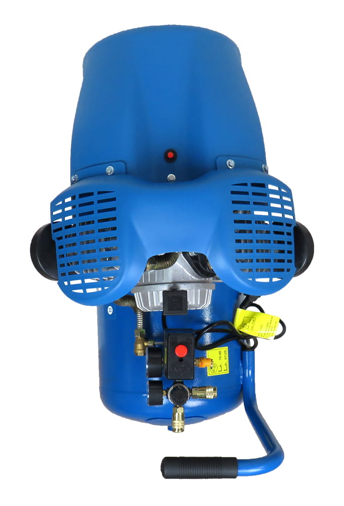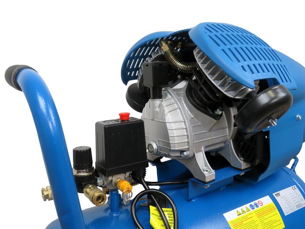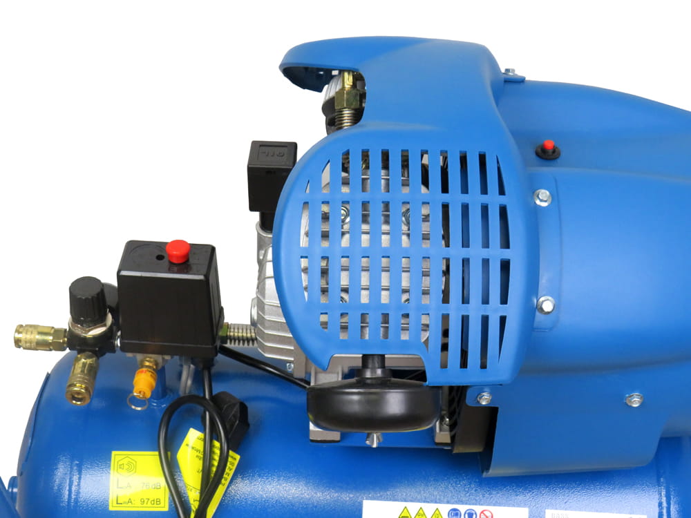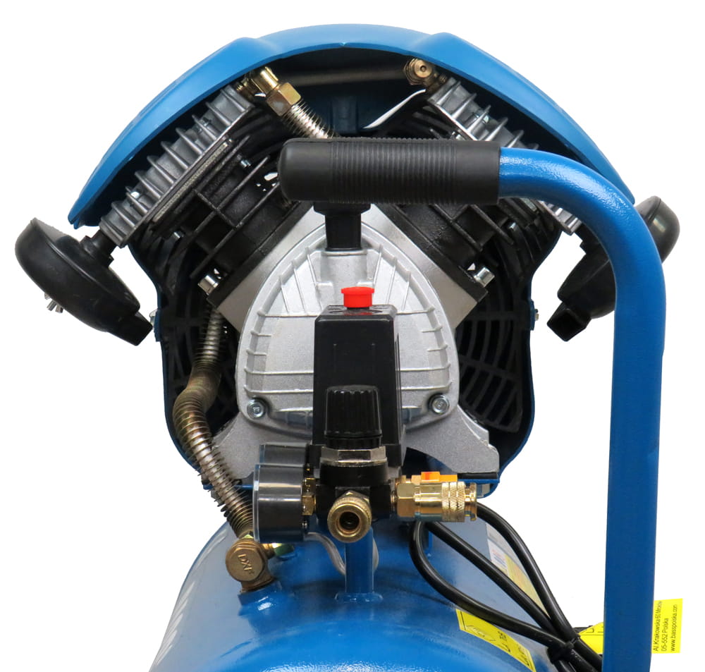 Sprężarka powietrza wyposażona dwa tłoki, podwójną kontrolę start/stop oraz kontrolę pracy kompresora, a także termiczną ochronę silnika przed przeładowaniem.