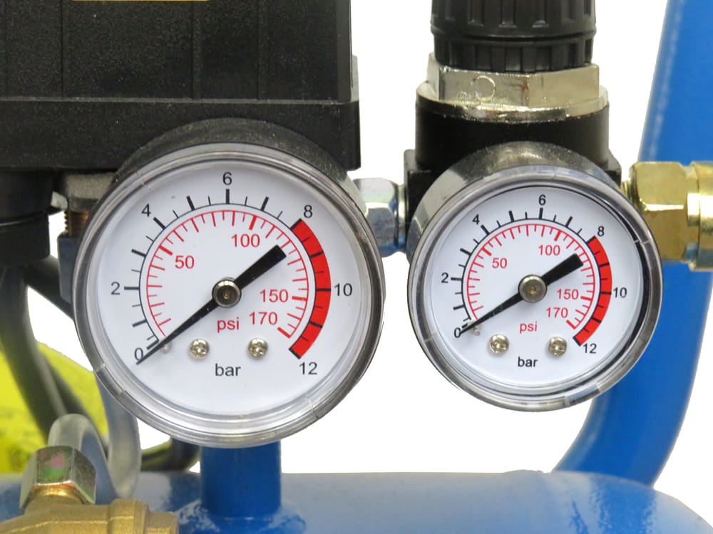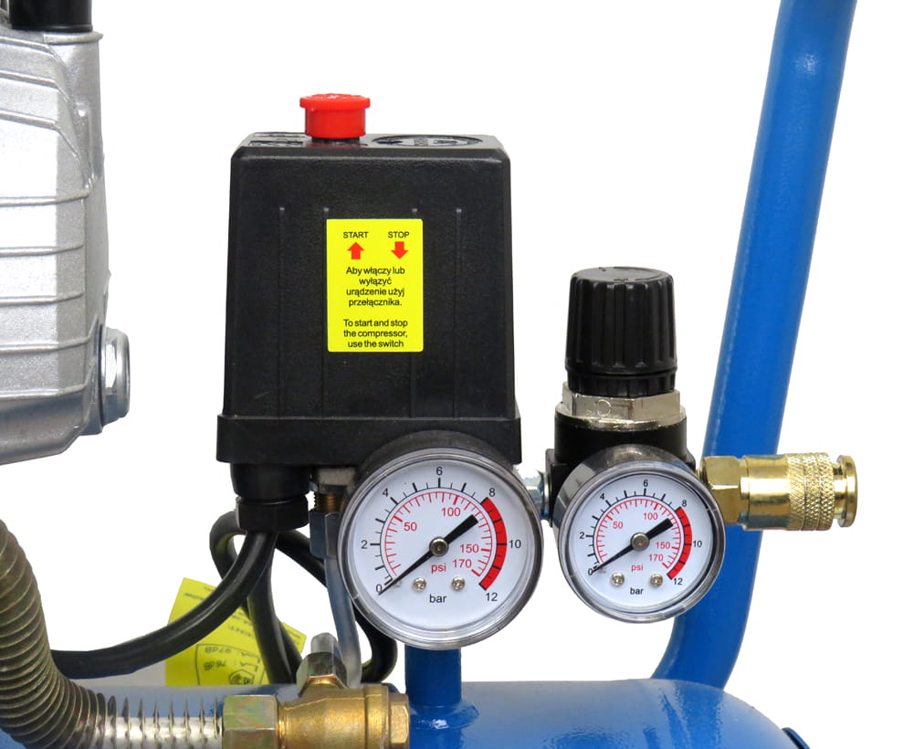 Wyłącznik ciśnieniowy ustawiony jest na ciśnienie maksymalne 8 bar, gdy ciśnienie w zbiorniku osiągnie tę wartość sprężarka się wyłącza, ponowne załączenie następuje, gdy ciśnienie w zbiorniku spadnie poniżej 6 bar.