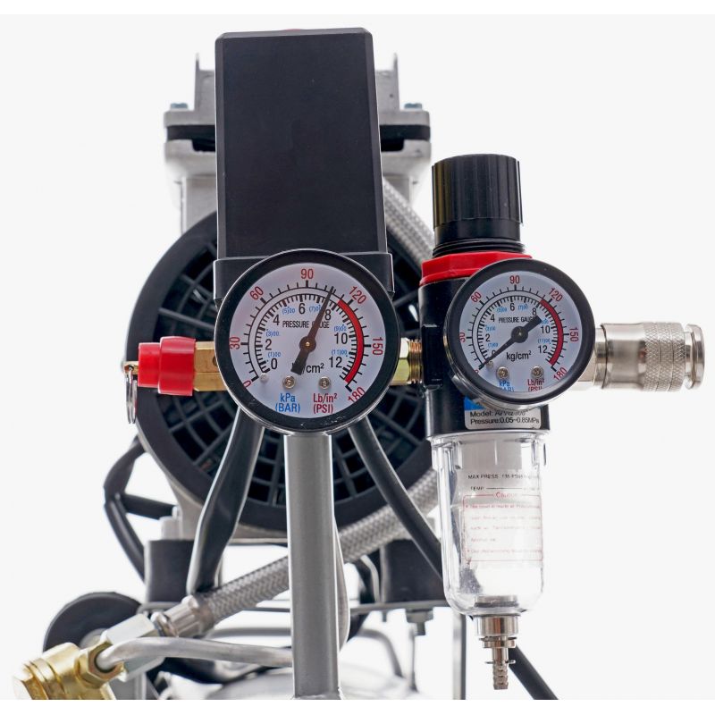 - Intuicyjna obsługa – czytelne manometry oraz łatwy dostęp do zaworu spustowego i odwadniacza.