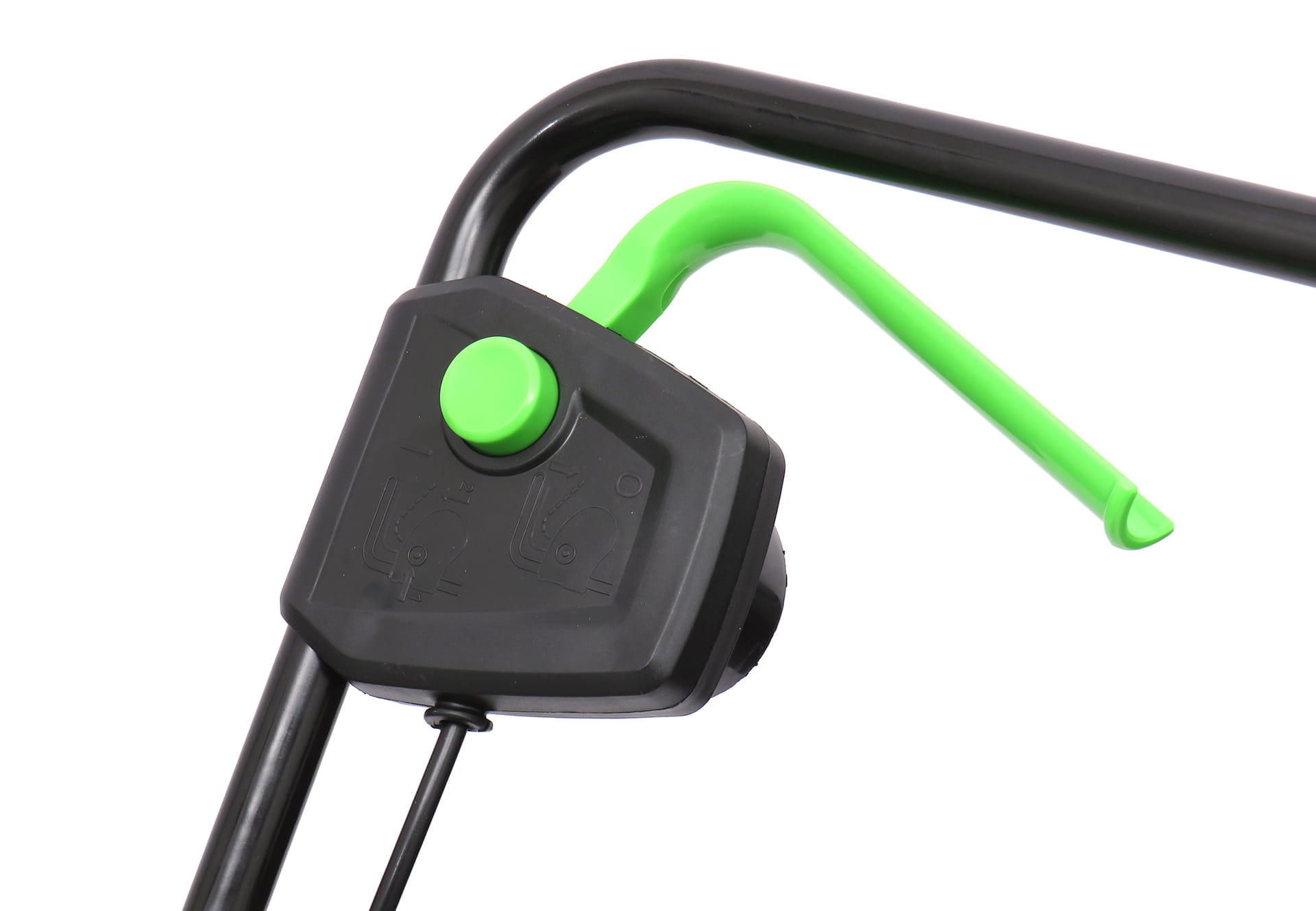Kosiarka została wyposażona w pałąkowy włącznik z blokadą oraz standardowym przyłączem do przedłużaczy kosiarkowych.