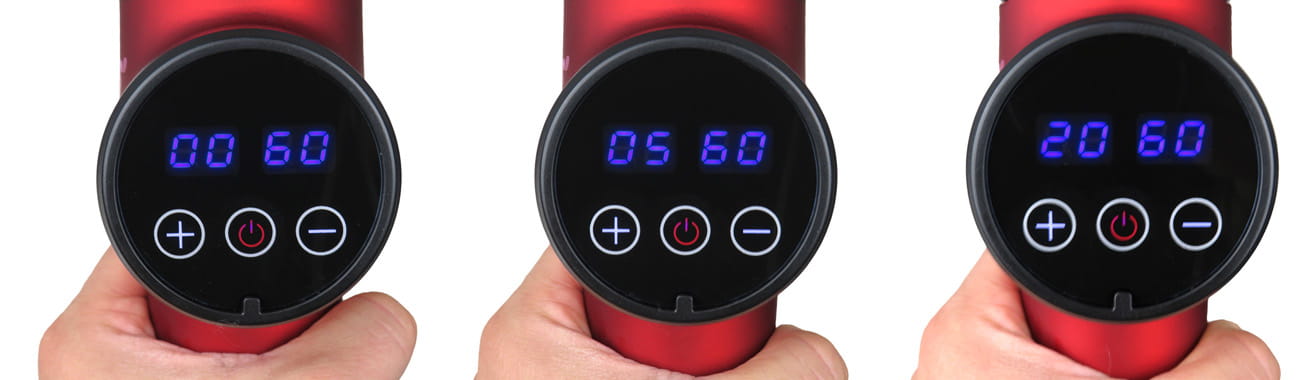 Masażer wyposażony został w dotykowy wyświetlacz LCD z dwudziestostopniową regulacją poziomu prędkości wibracji: