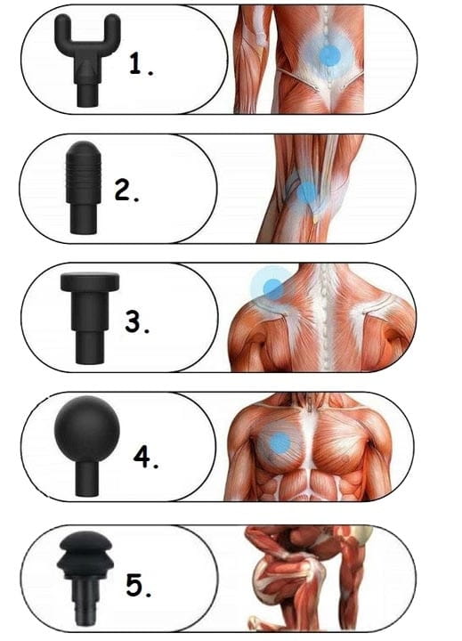 - Pocisk – najbardziej precyzyjna ze wszystkich końcówek. Wykonana z twardego tworzywa i przeznaczona do punktów spustowych (zgrubień na tkance mięśniowej powodujących ból, często promieniujący do innych obszarów ciała). Dokładnie dociera do najtrudniej położonych grup mięśniowych.