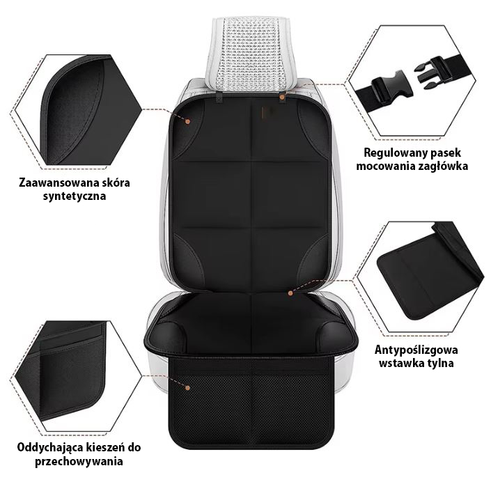 - Skuteczna ochrona – zabezpiecza tapicerkę przed zabrudzeniami, wilgocią oraz odgnieceniami powstającymi pod fotelikiem dziecięcym
