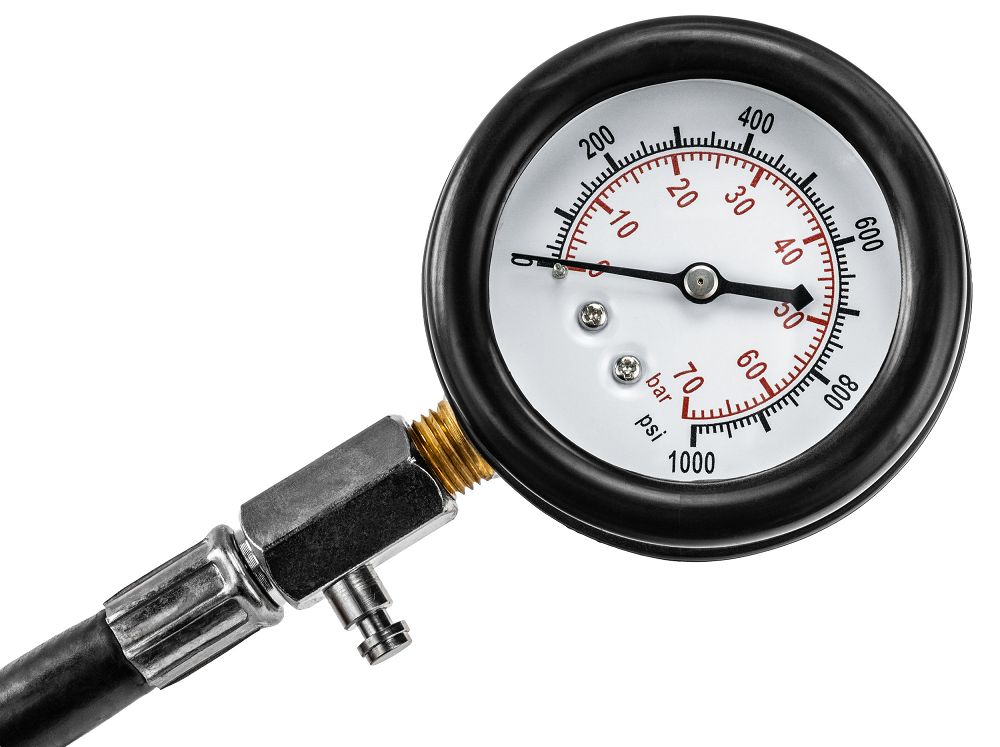 - Czytelny odczyt – manometr z podwójną skalą (bar/psi) umożliwia wygodne monitorowanie wyników pomiaru.