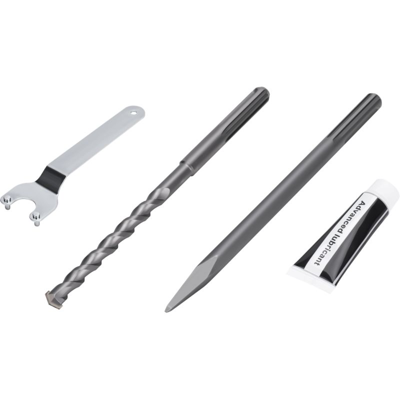 W komplecie znajdują się dwa akumulatory o pojemności 4Ah, szybka ładowarka, wiertło, końcówka do kucia oraz instrukcja obsługi w języku polskim. Dzięki temu użytkownik otrzymuje kompletny zestaw gotowy do pracy.