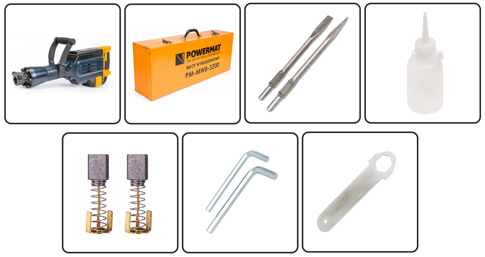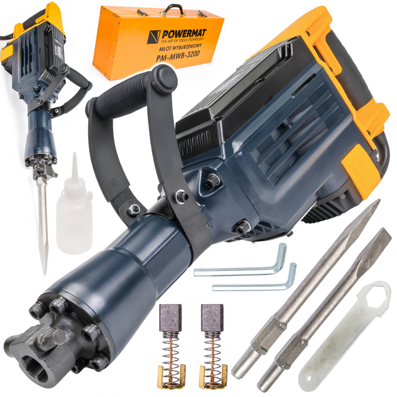 Do młota dołączamy dłuto i szpicak HEX 30mm, dzięki czemu możesz od razu po otrzymaniu towaru rozpocząć prace z urządzeniem.