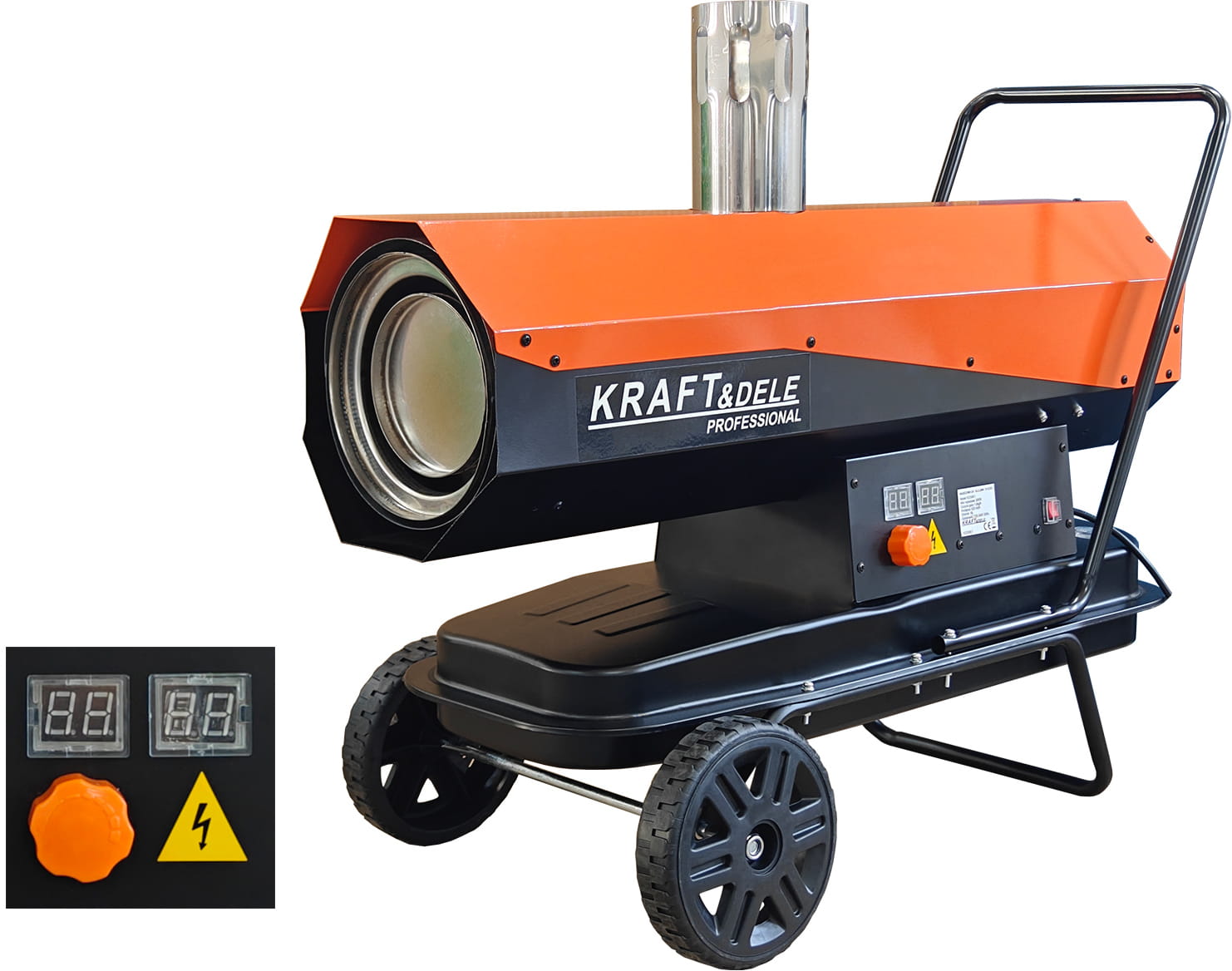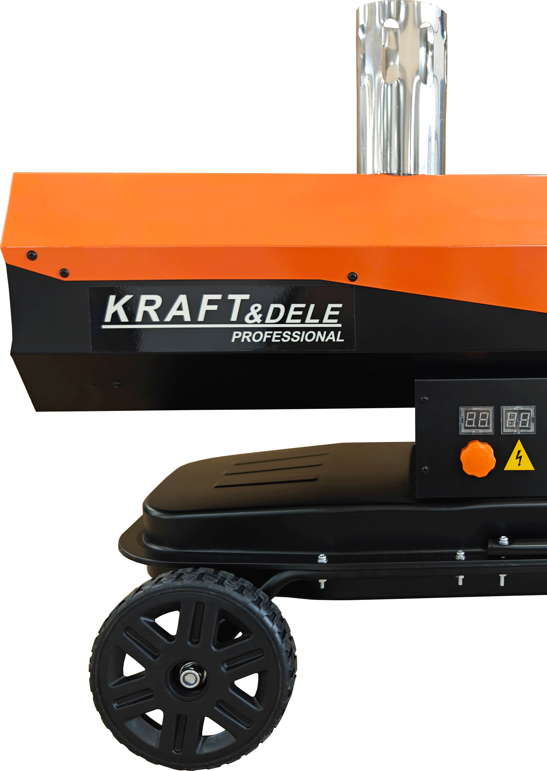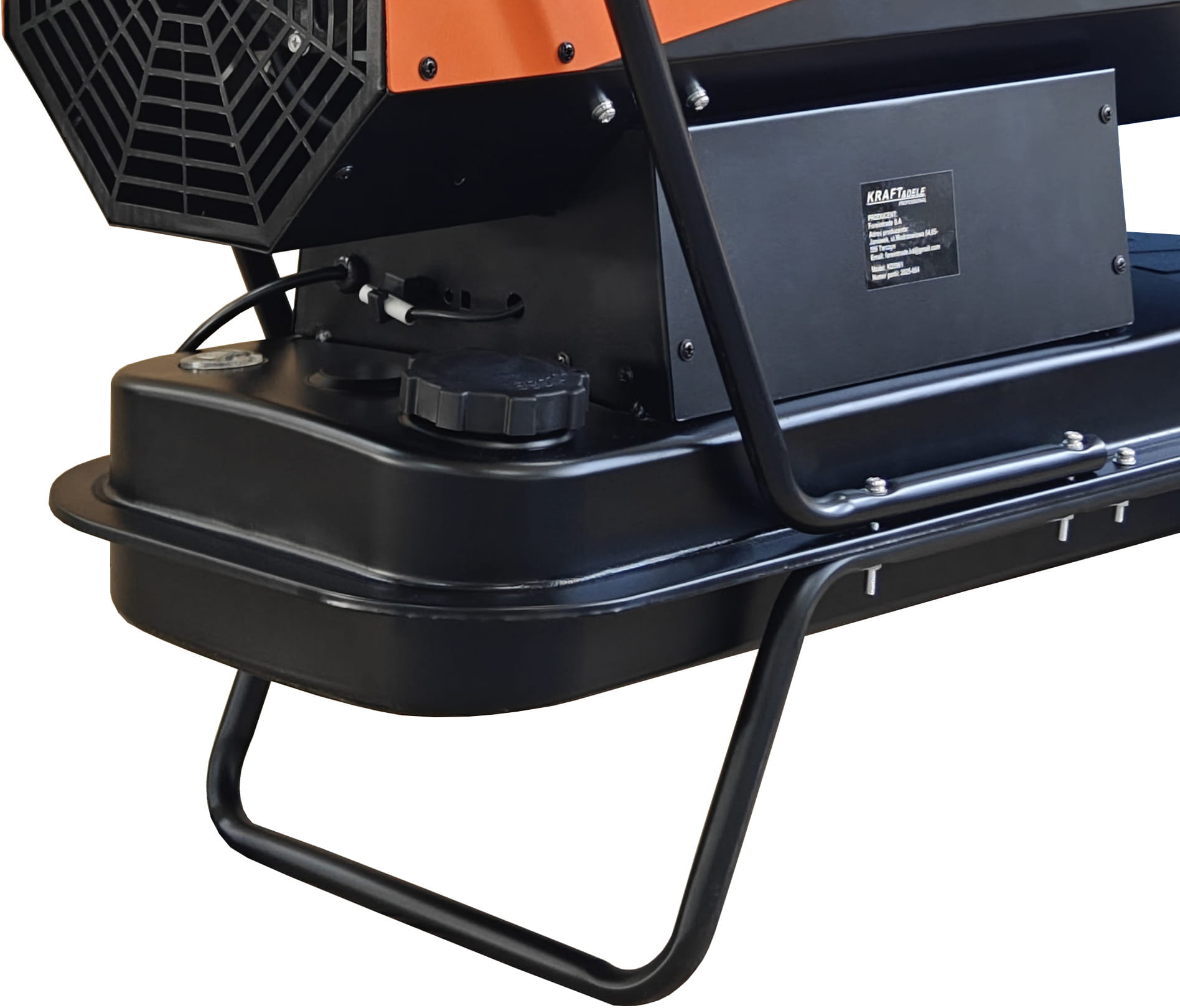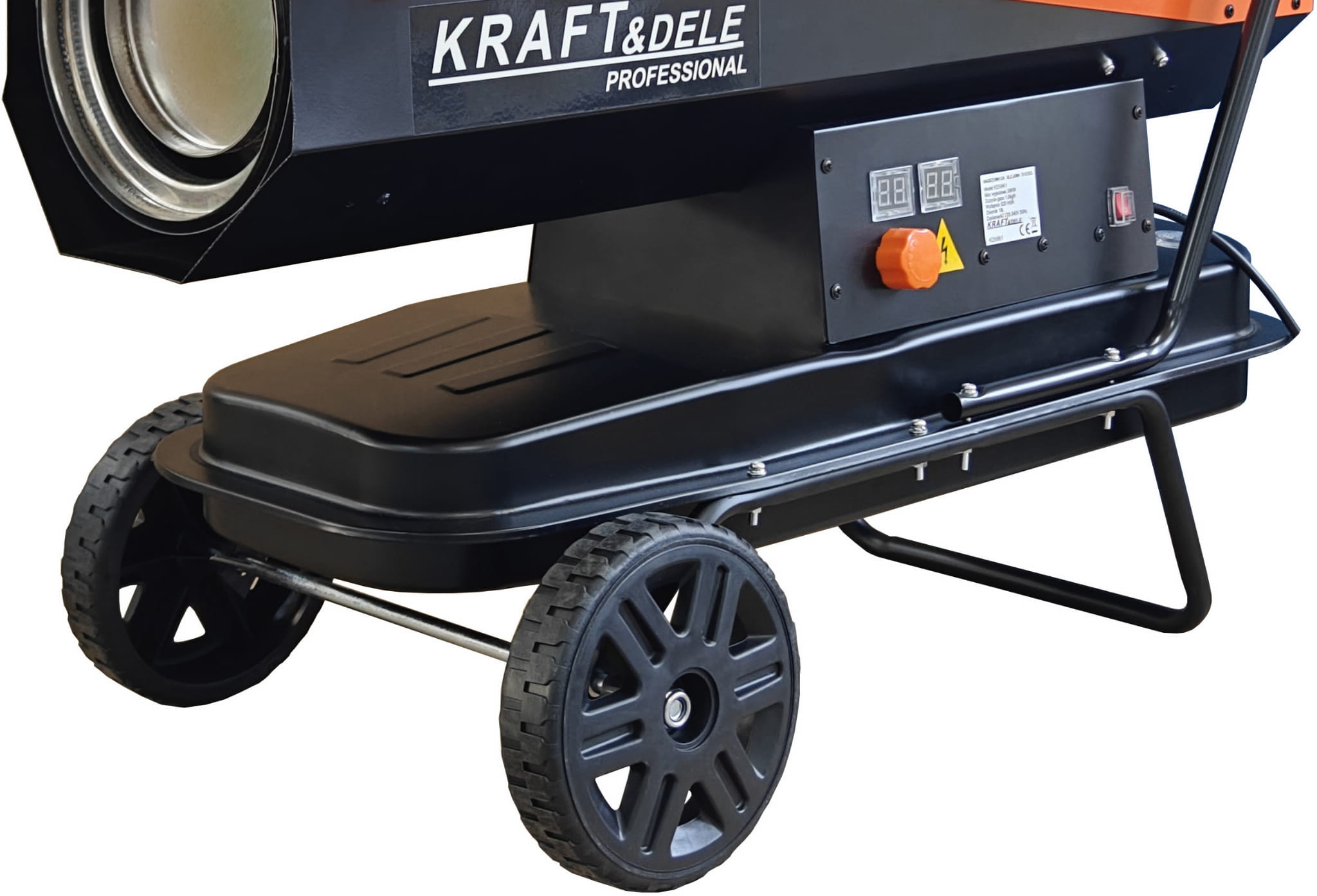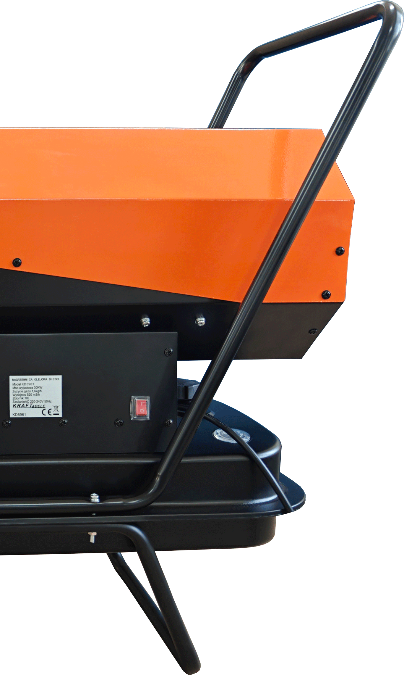 Urządzenie zostało wykonane z solidnej stali, co zapewnia wysoką odporność na uszkodzenia mechaniczne i intensywną eksploatację. Stabilna konstrukcja oraz zastosowanie dużych kół transportowych umożliwiają łatwe przemieszczanie nagrzewnicy nawet po nierównym podłożu. Ergonomiczny uchwyt dodatkowo ułatwia transport i obsługę urządzenia.