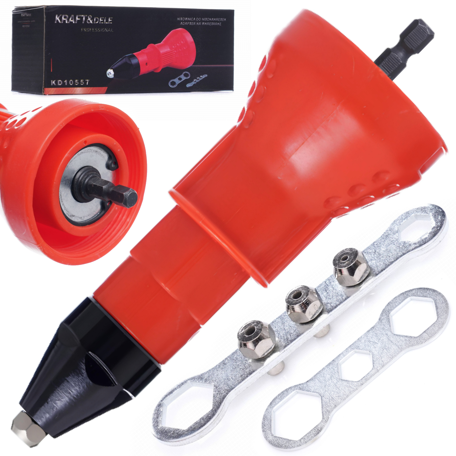 Dzięki temu urządzeniu w niesamowicie łatwy i szybki sposób wykonasz mocowania za pomocą nitów. Nitownica na wkrętarkę / wiertarkę w całości wykonana jest ze stali oraz solidnego tworzywa sztucznego- wyjątkowo solidna konstrukcja. Adapter pasuje do każdej standardowej wkrętarki lub wiertarki.