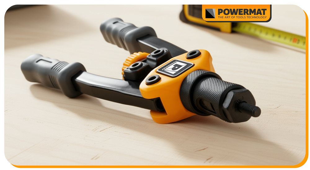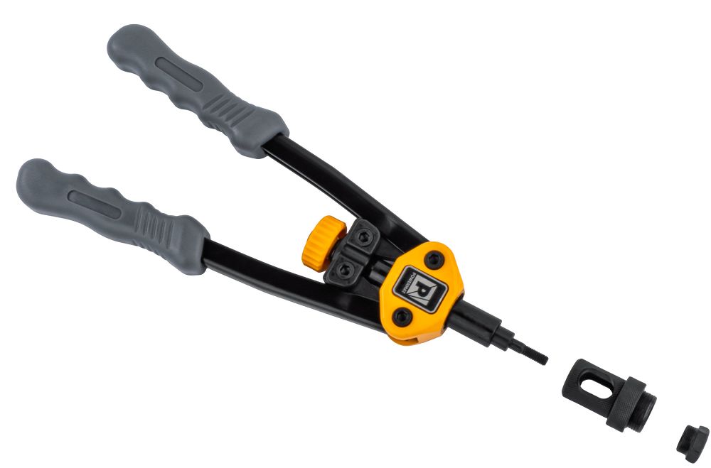 - Mechanizm nożycowy zwiększający siłę – konstrukcja dźwigniowa pozwala uzyskać wysoki nacisk trzpienia przy niewielkiej sile rąk, co ułatwia dokładne i powtarzalne osadzanie nitonakrętek