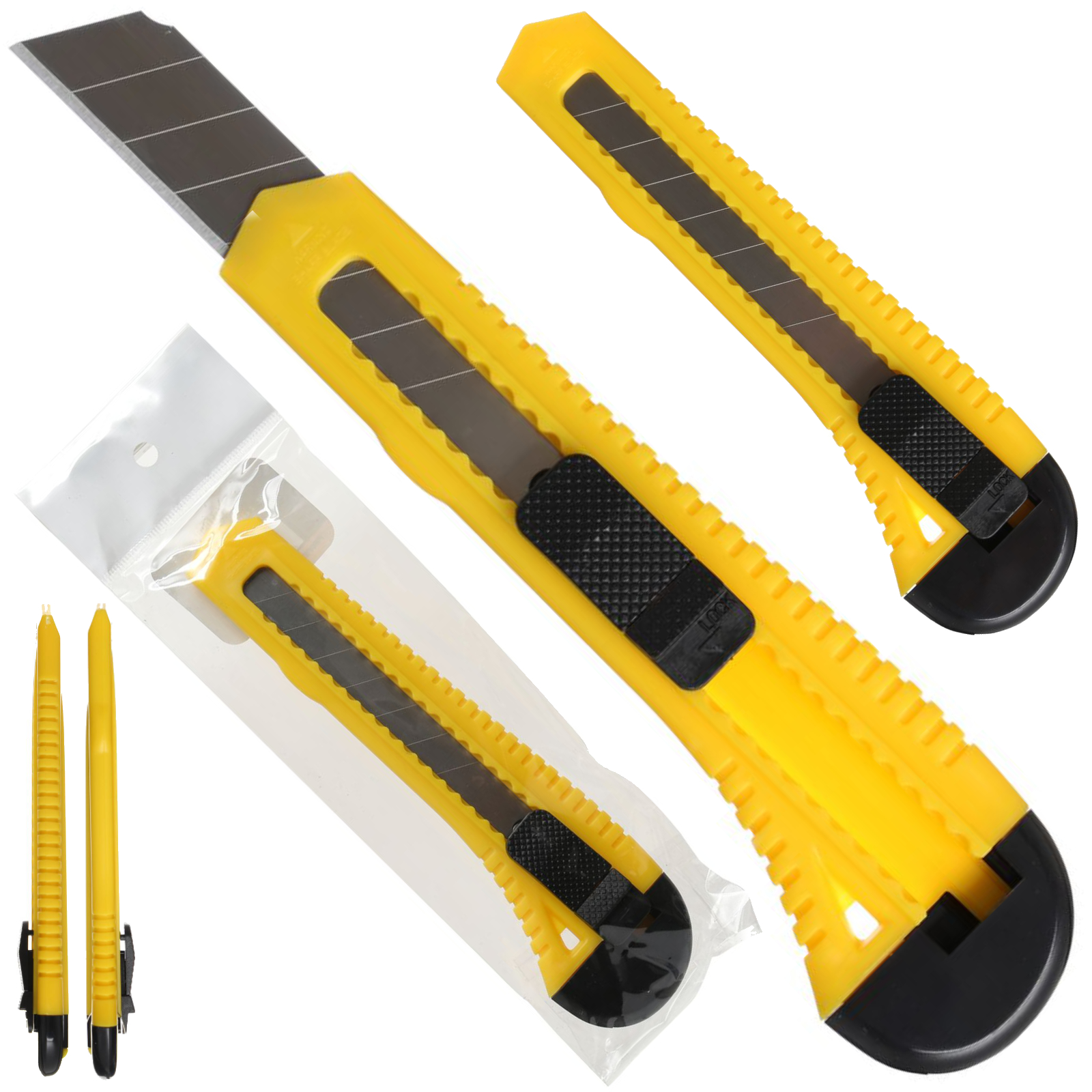 NÓŻ Z ŁAMANYM OSTRZEM DO CIĘCIA 18MM ŻÓŁTY 8 SEGMENTÓW BLOKADA RĘCZNA