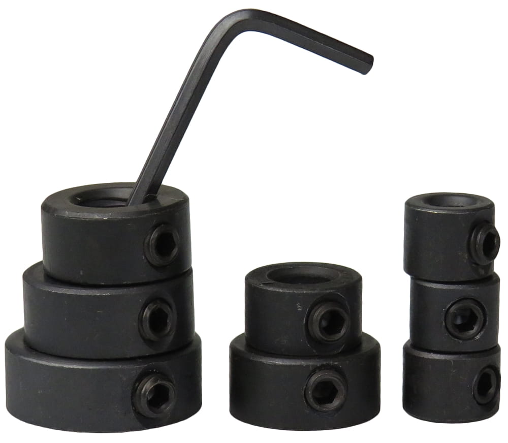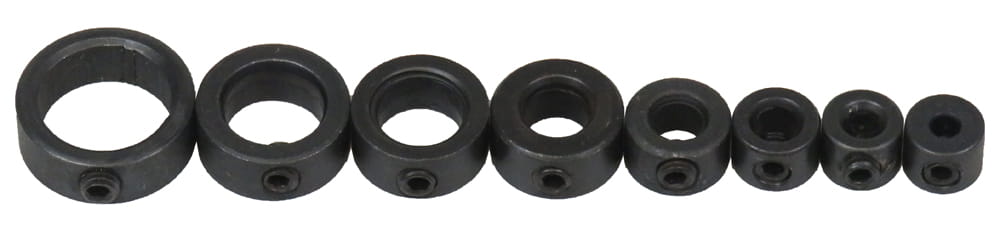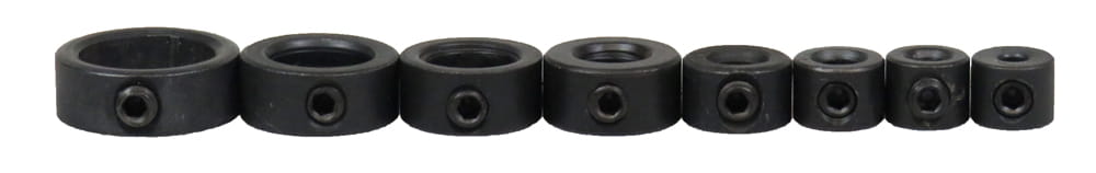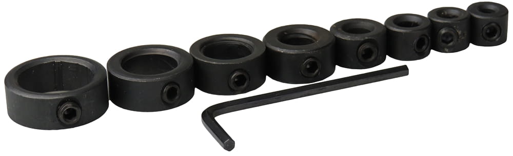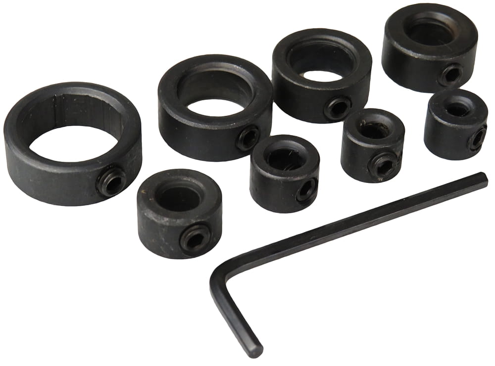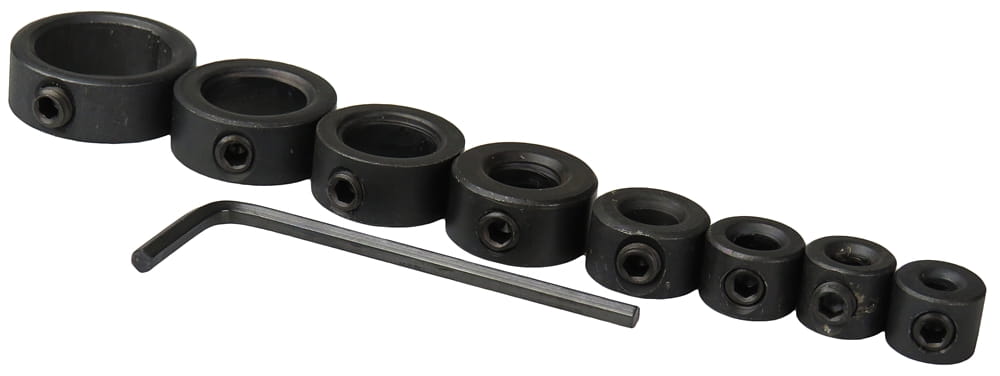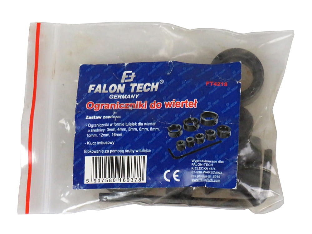 W komplecie znajduje się 8 ograniczników przeznaczonych do wierteł 3, 4, 5, 6, 8, 10, 12 i 16 mm oraz kluczyk do dokręcania śrubki blokującej.