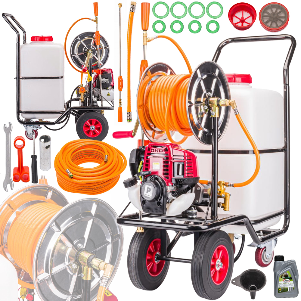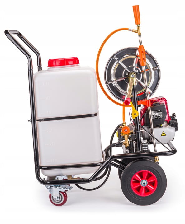 OPRYSKIWACZ SPALINOWY WÓZKOWY TACZKOWY SADOWNICZY 60L WĄŻ 28M + OLEJ