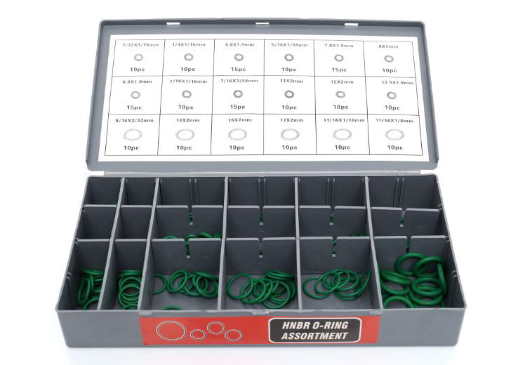 Zestaw O-ringów został wykonany z wysokiej jakości materiału HNBR. Uwodorniony kauczuk butadienowo akrylonitrylowy Elastomery HNBR zostały opracowane tak, aby sprostać wyższym temperaturom niż oringi wykonane z NBR, zachowując jednocześnie odporność na oleje i smary mineralne.
