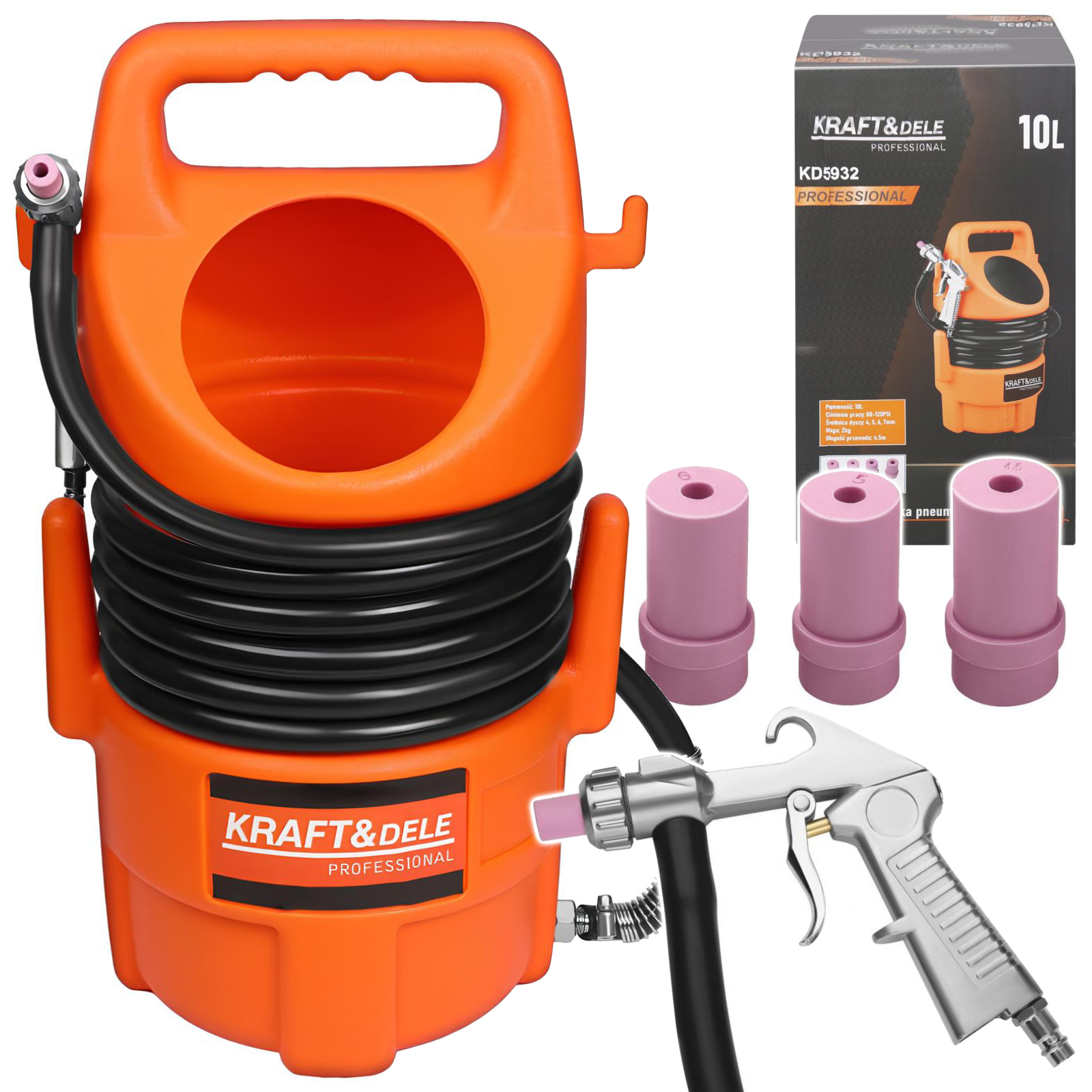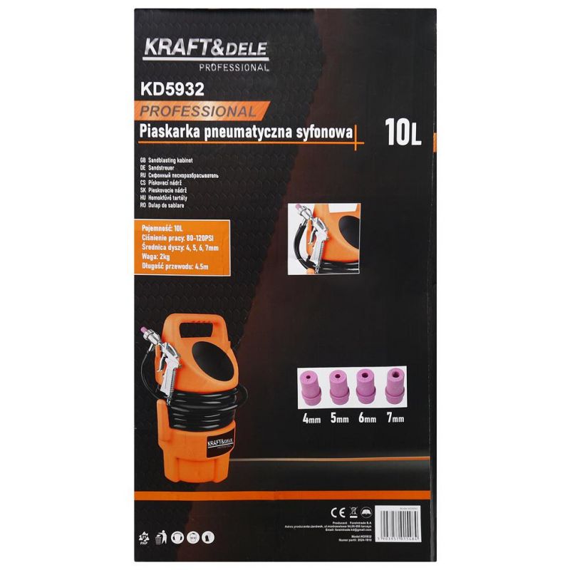 Piaskarka wyposażona została w przewód o długości 4,5 m, co zapewnia swobodę pracy, a także w cztery wymienne dysze o średnicach 4, 5, 6 i 7 mm, umożliwiające dostosowanie intensywności strumienia ścierniwa do rodzaju obrabianej powierzchni.