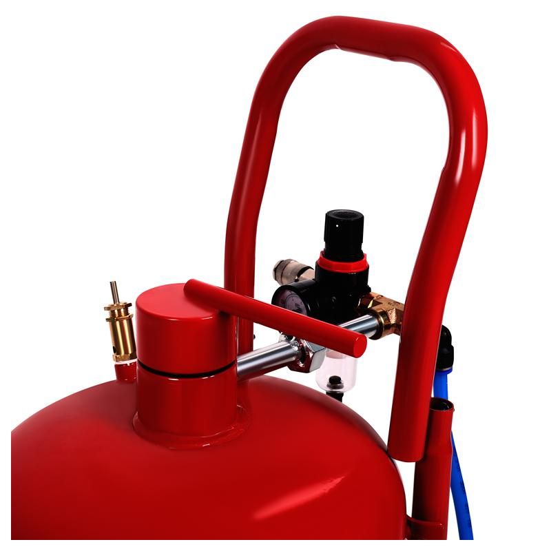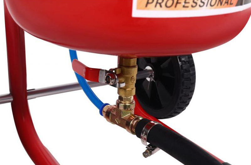 Piaskarka została umieszczona na stabilnym stojaku wyposażonym w kółka, co umożliwia łatwe przestawianie urządzenia w miejscu pracy. Solidna konstrukcja i użyte materiały zapewniają odporność na zużycie oraz trwałość nawet przy intensywnym użytkowaniu.