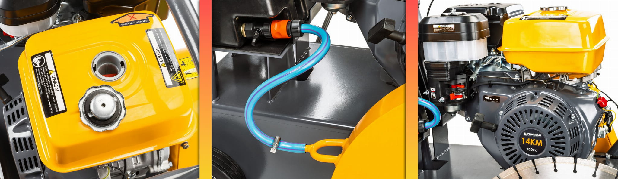 Piła została wyposażona w potężny silnik o mocy 14 KM, który zapewnia niezawodną pracę nawet przy cięciu najtwardszych materiałów takich jak asfalt, beton i kamień. Dzięki temu możliwe jest szybkie i precyzyjne przecinanie betonu, asfaltu i kamienia bez utraty jakości cięcia.