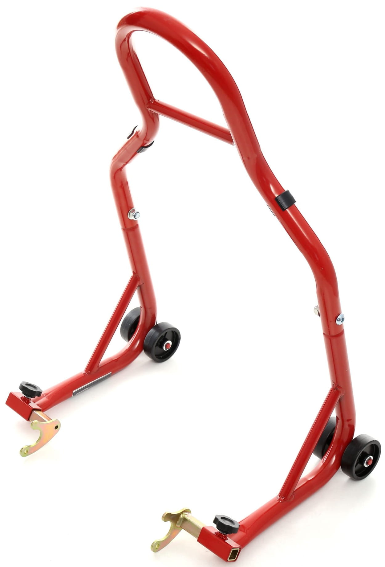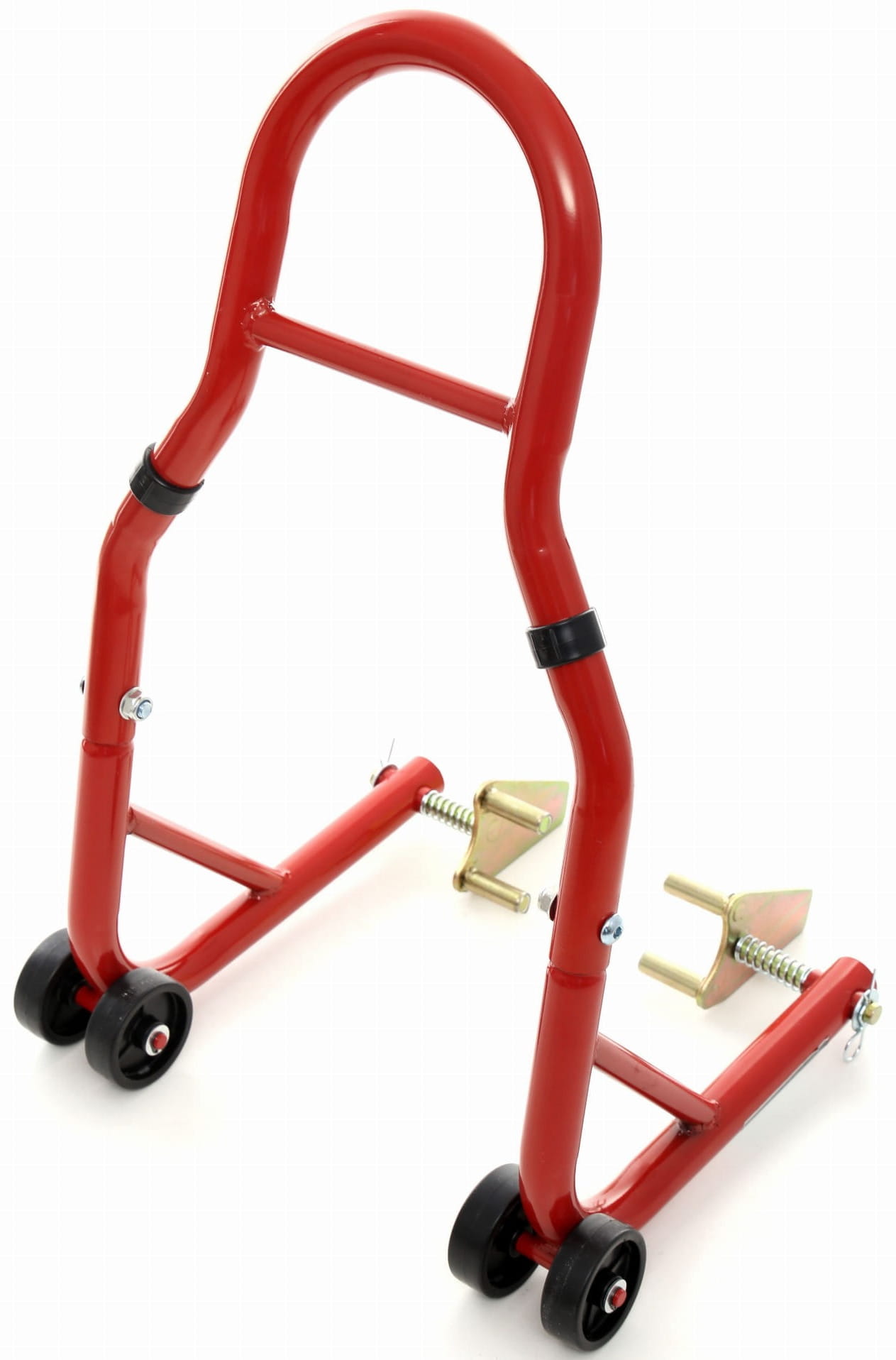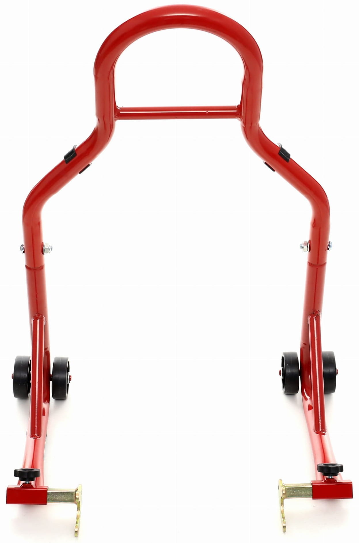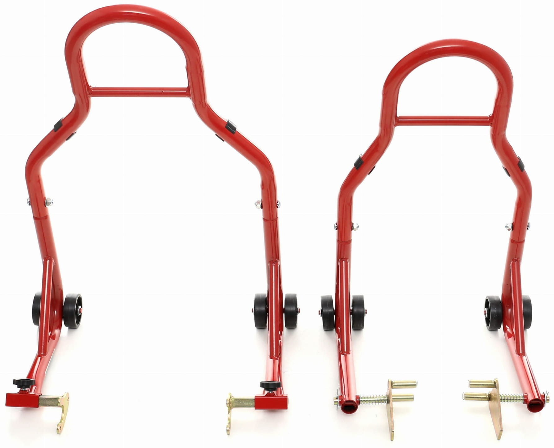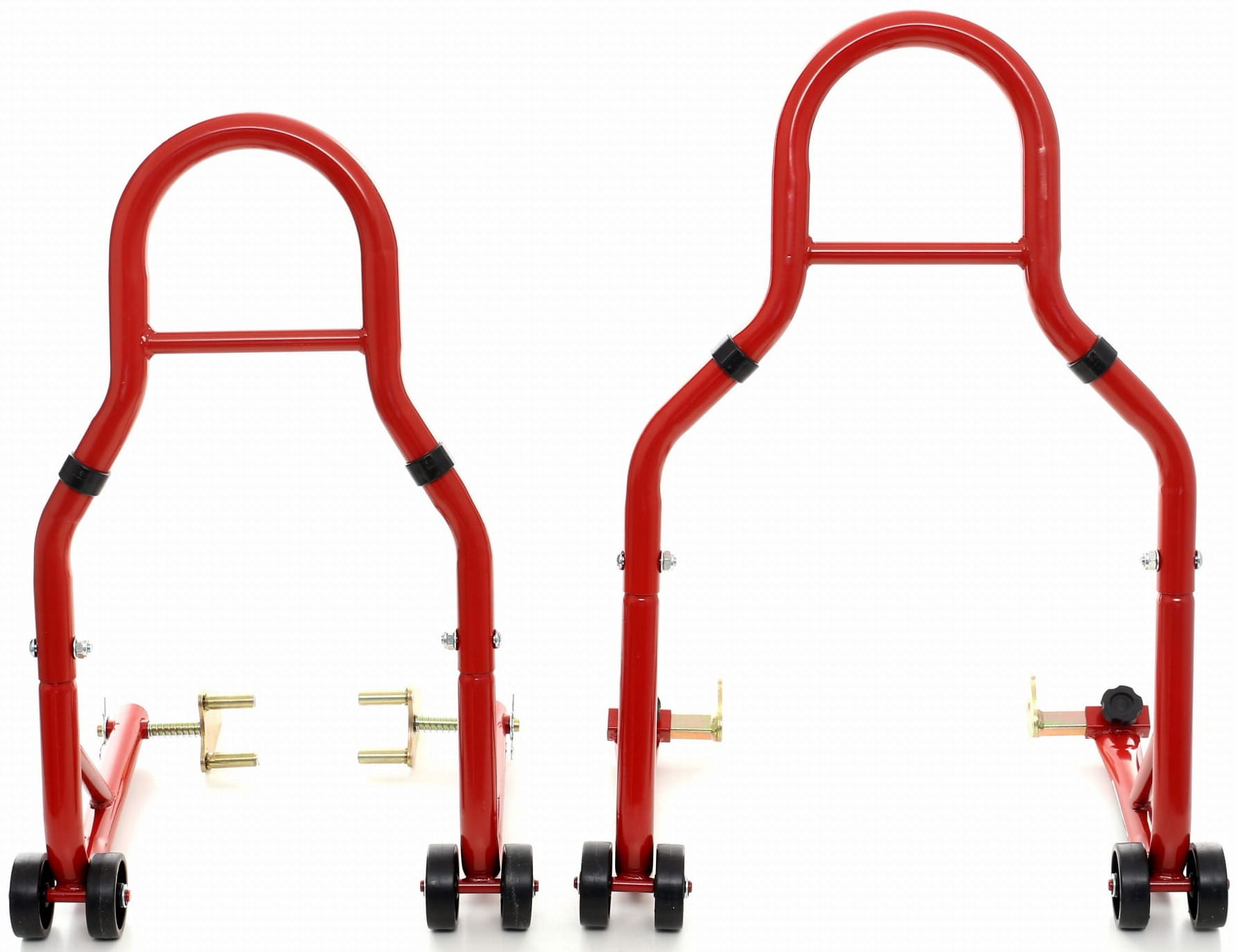 Zestaw stojaków motocyklowych przeznaczony jest do stabilnego unoszenia zarówno przedniego, jak i tylnego koła motocykla. Umożliwia bezpieczne podparcie jednośladu, zapewniając wygodny dostęp do kluczowych elementów podczas prac serwisowych, konserwacyjnych oraz w trakcie dłuższego przechowywania pojazdu.