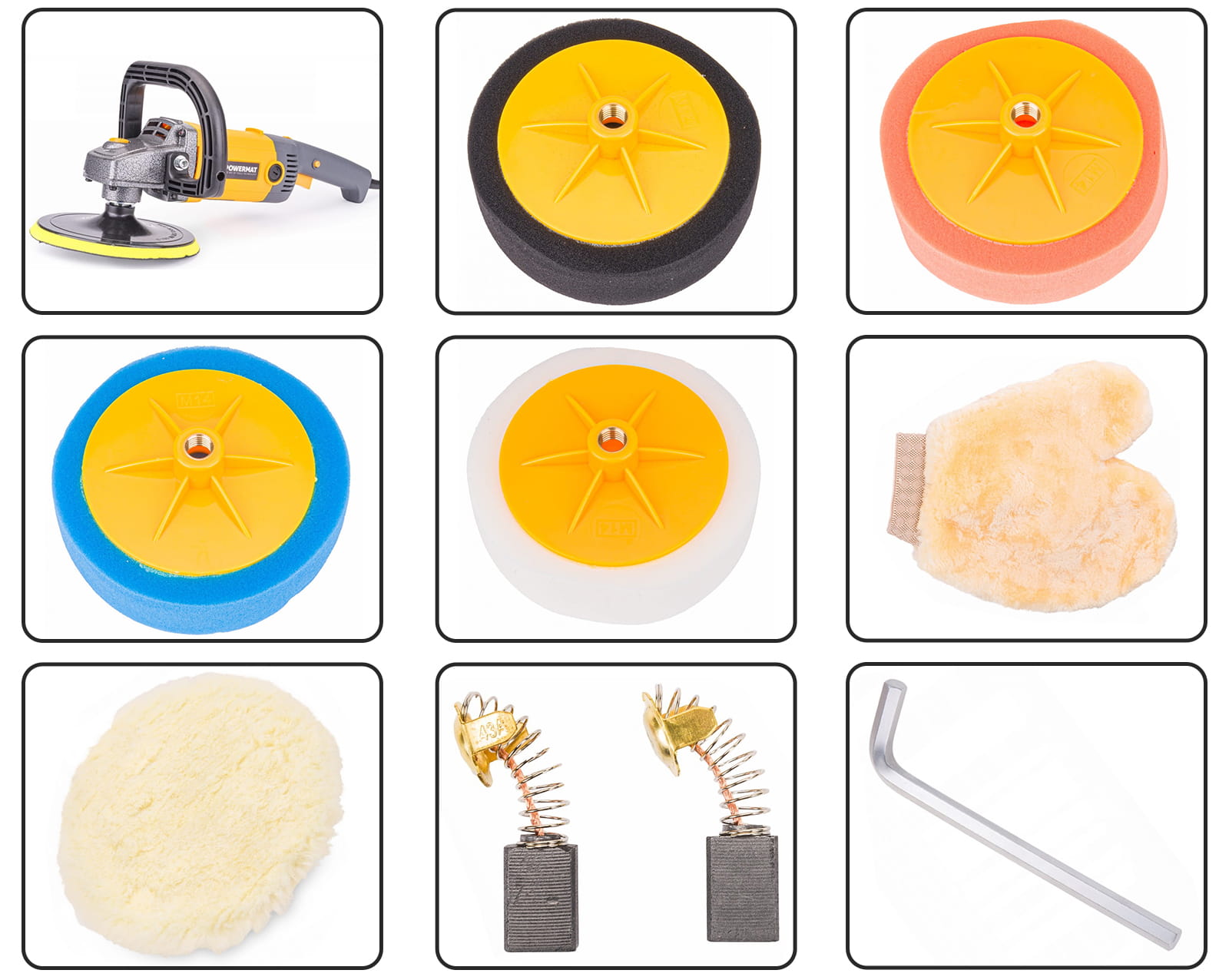 - 4 pady polerskie (czarny – twardy, pomarańczowy – średnio twardy, biały – średnio miękki, niebieski – miękki)