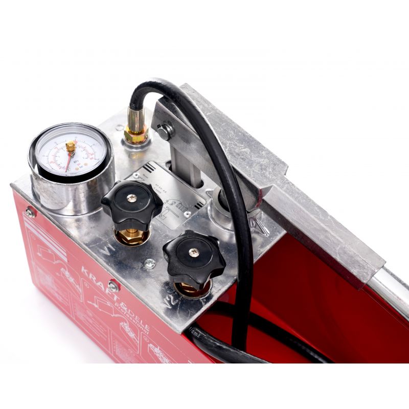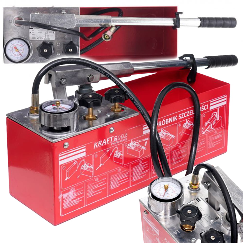 Pompa do prób ciśnieniowych marki Kraft&Dele to precyzyjne narzędzie wykorzystywane do wykonywania prób ciśnieniowych, prób szczelności w instalacjach sanitarnych przy użyciu wody lub oleju jako cieczy testowej przy maksymalnym ciśnieniu testowym 50bar.