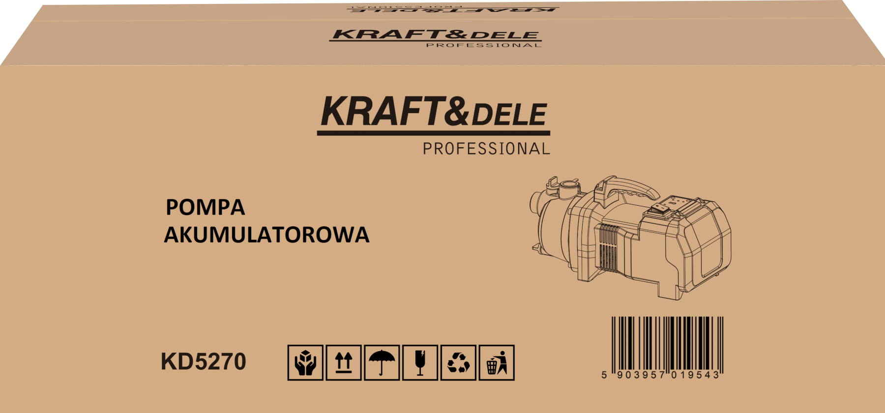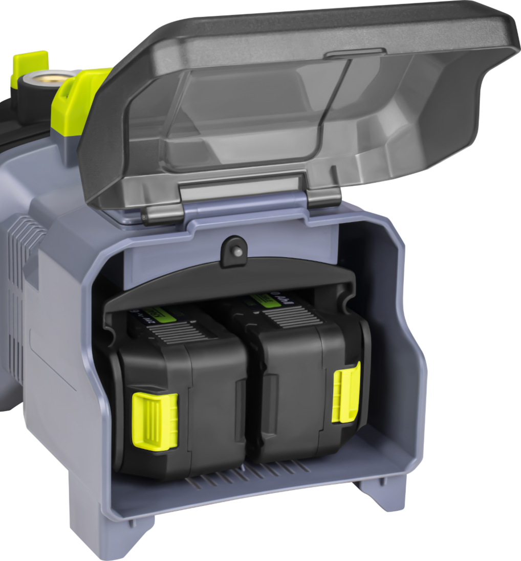 Kompaktowa obudowa oraz stabilna podstawa zapewniają bezpieczne ustawienie pompy podczas pracy. Akumulatory umieszczone są w osłoniętej komorze, co poprawia estetykę oraz chroni elementy zasilania. Wygodny uchwyt transportowy ułatwia przenoszenie urządzenia między miejscami pracy.