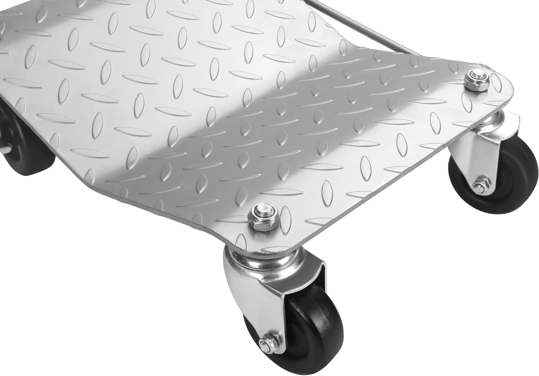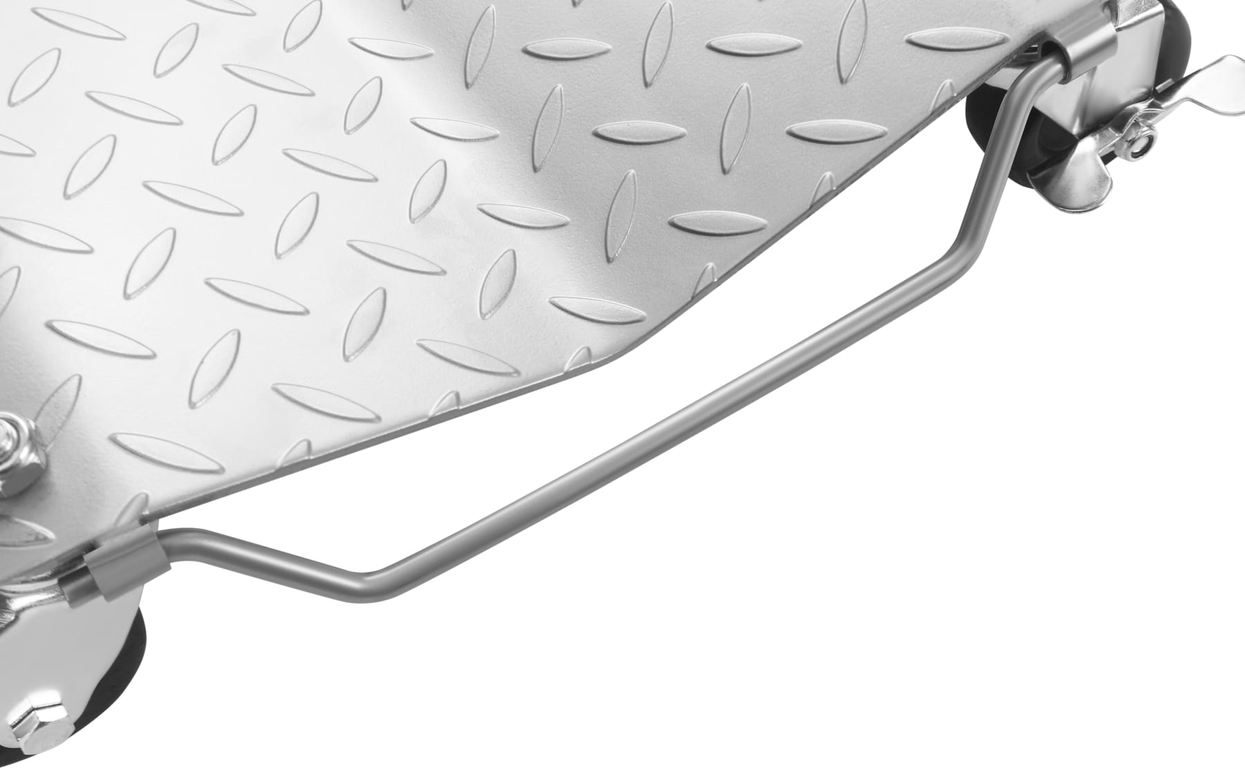 Stabilna, metalowa rama zapewnia odpowiednią sztywność konstrukcji pod obciążeniem. Ryflowana powierzchnia blatu poprawia przyczepność ładunku, a jego wgłębiony profil zwiększa bezpieczeństwo transportu. Skrętne koła umożliwiają płynne zmiany kierunku jazdy, natomiast blokady zapobiegają niekontrolowanemu przemieszczaniu się platformy. Składany uchwyt pozwala na wygodne przenoszenie oraz oszczędność miejsca podczas przechowywania.