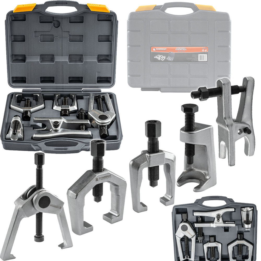 Zestaw obejmuje kilka typów ściągaczy, w tym modele zaciskowe, dwuramienne oraz narzędzia przeznaczone do sworzni i końcówek drążków. Takie rozwiązanie pozwala dobrać odpowiednie narzędzie do konkretnego zadania, zwiększając efektywność pracy oraz ograniczając ryzyko uszkodzeń demontowanych elementów.