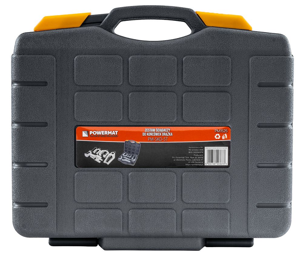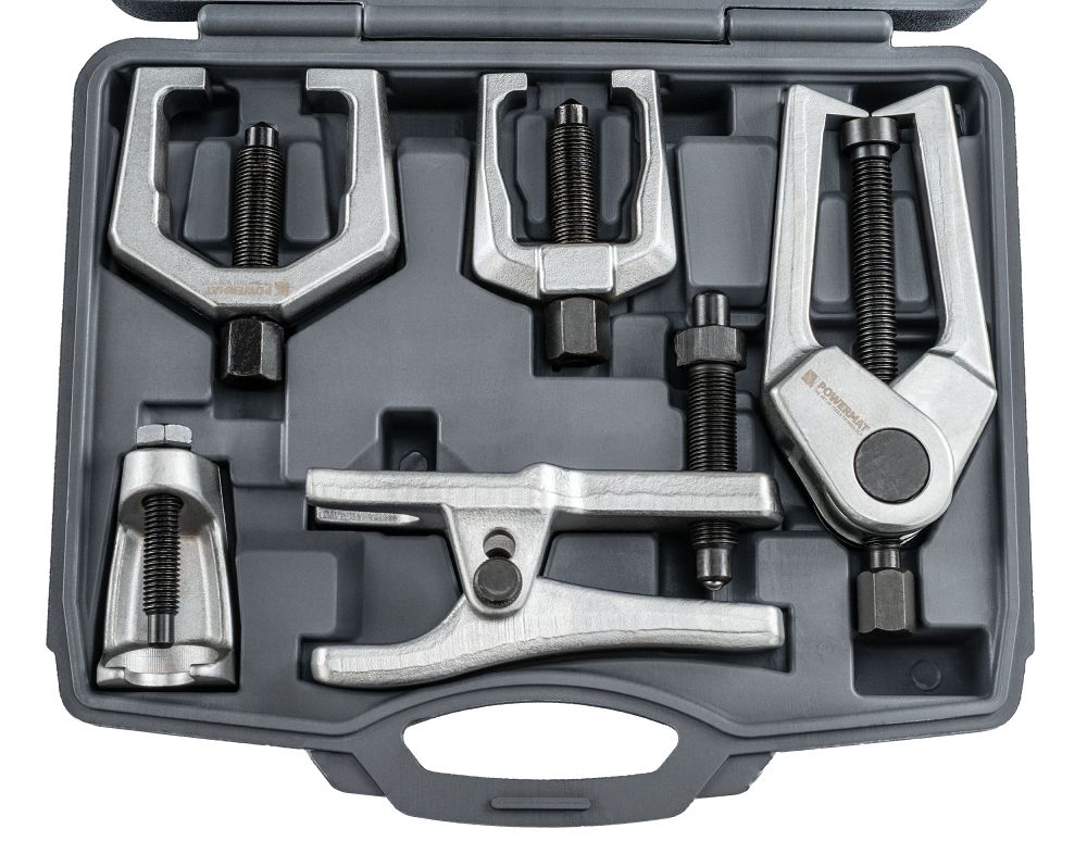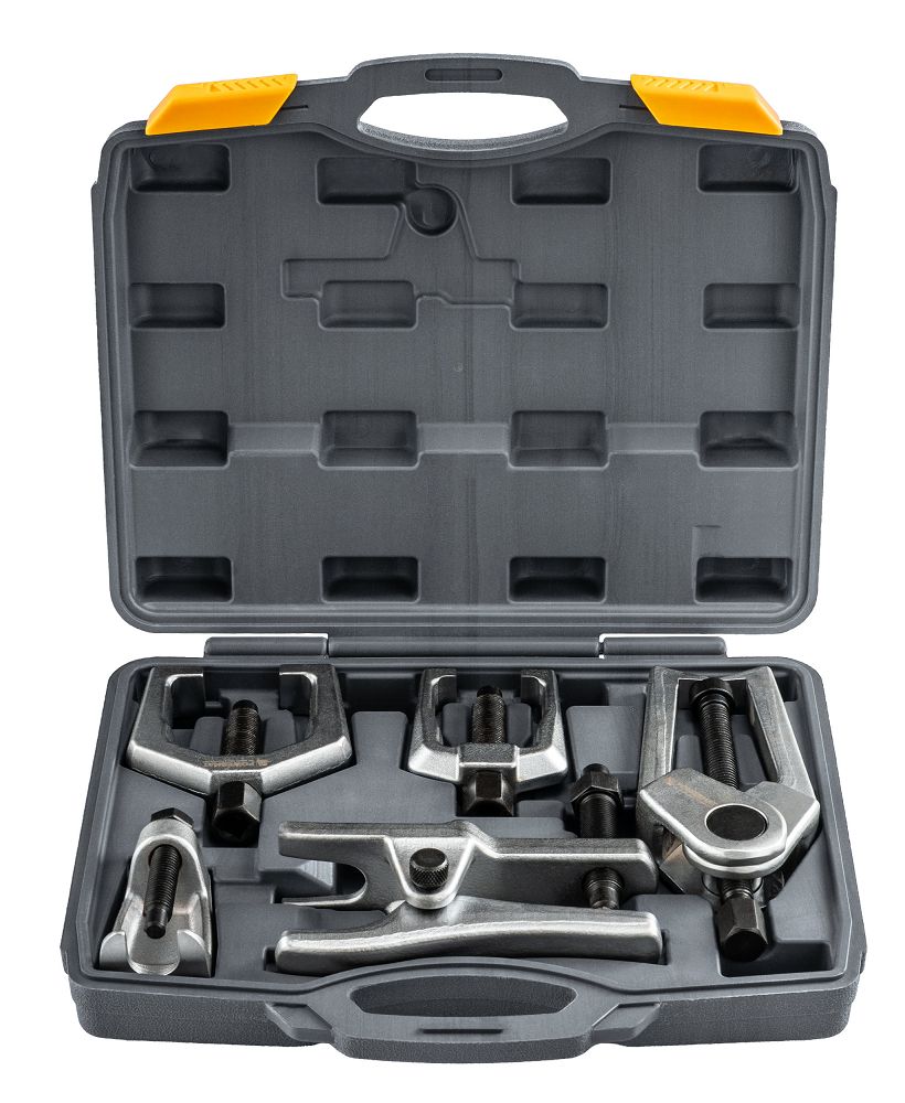 Zestaw ściągaczy do końcówek drążków i sworzni to praktyczne rozwiązanie przeznaczone do prac serwisowych w układach kierowniczych oraz zawieszenia. Komplet pięciu narzędzi umożliwia sprawny i kontrolowany demontaż połączeń, ograniczając ryzyko uszkodzenia elementów. Całość została zaprojektowana z myślą o wygodzie użytkowania oraz uporządkowanym przechowywaniu.