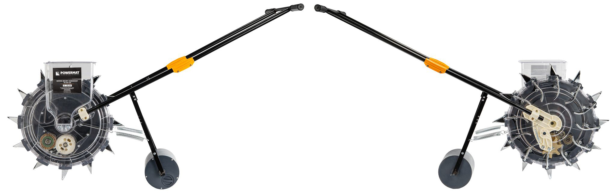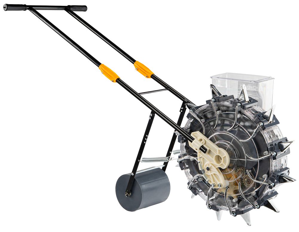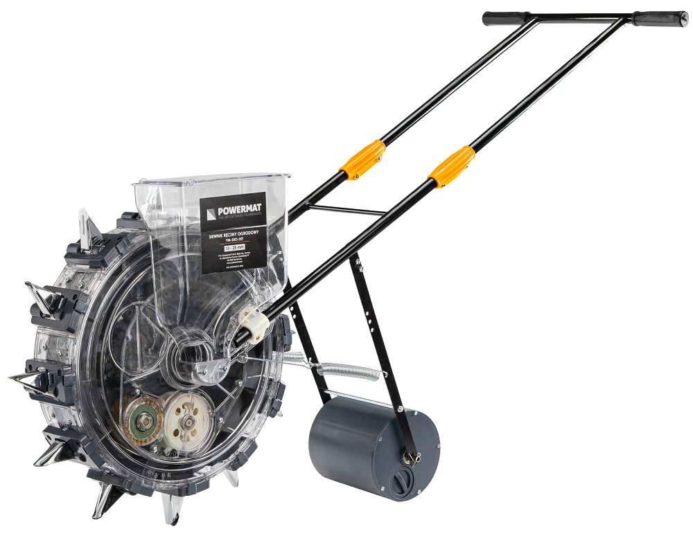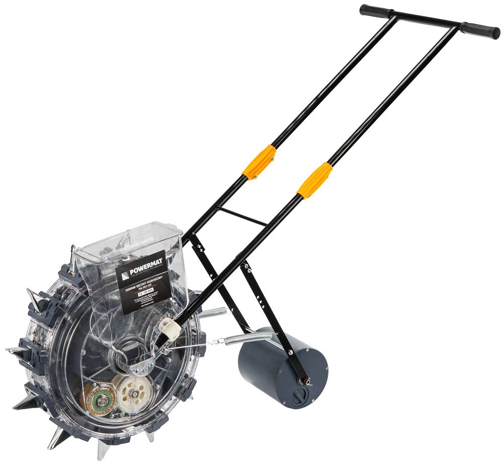 Konstrukcja siewnika została zaprojektowana z myślą o stabilnym prowadzeniu i wygodzie użytkowania. Odpowiednio dobrany rozstaw rączki oraz optymalna wysokość urządzenia pozwalają na pracę w naturalnej pozycji.