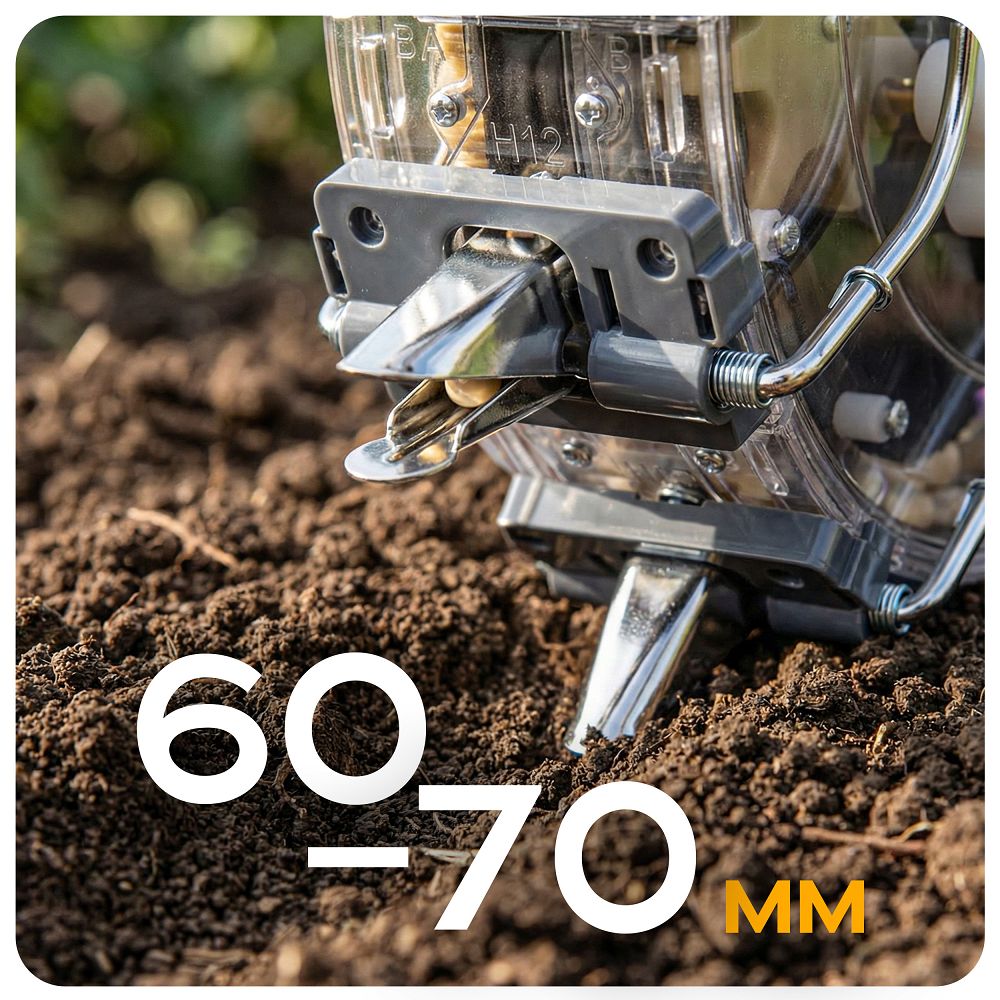 - Regulowana głębokość pracy – możliwość ustawienia w zakresie 60–70 mm pozwala dopasować siew do rodzaju gleby i nasion