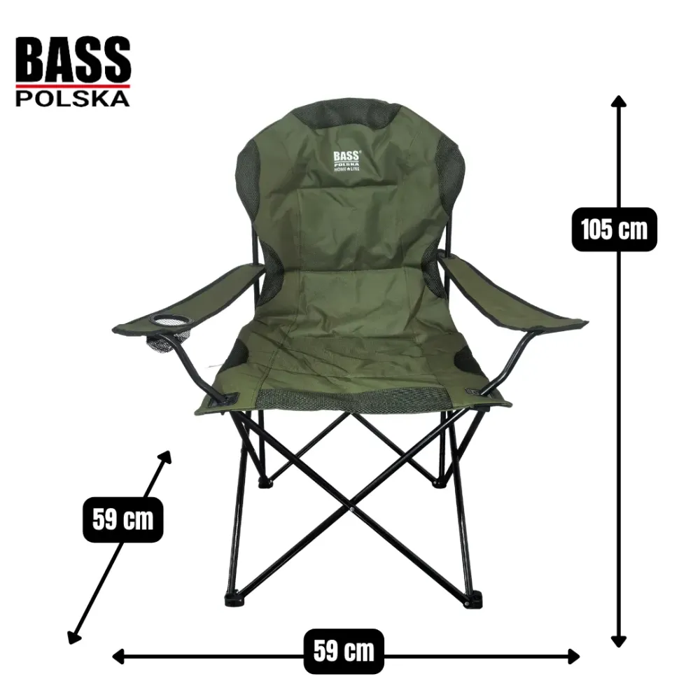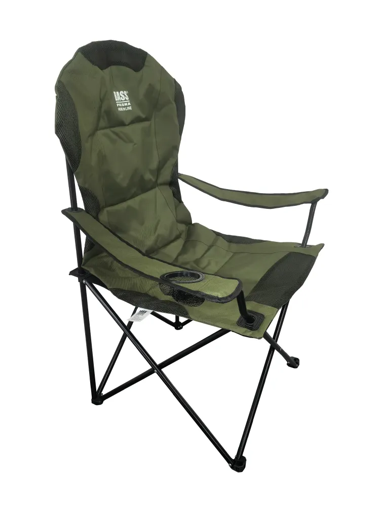 Szerokie siedzisko o wymiarach 59 × 59 cm oraz wysokie, 105-centymetrowe oparcie pozwalają na wygodne siedzenie nawet przez dłuższy czas. Siatkowe panele wspomagają cyrkulację powietrza w cieplejsze dni, a podłokietniki i uchwyt na napój zwiększają funkcjonalność.