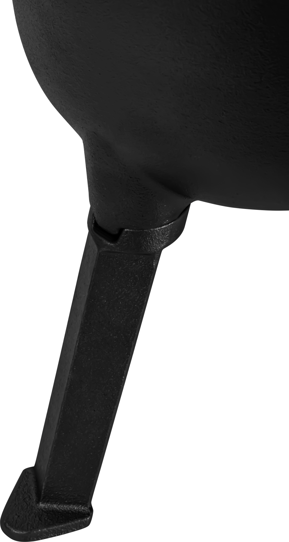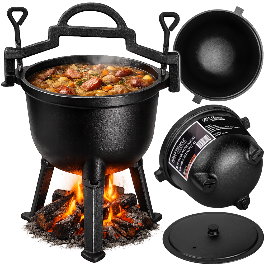 Solidna konstrukcja z litego żeliwa zapewnia stabilność i odporność na intensywne użytkowanie. Odkręcany trójnóg umożliwia bezpieczne ustawienie naczynia bezpośrednio w żarze, bez konieczności zawieszania nad ogniem. Stabilne nóżki oraz masywna pokrywa zwiększają bezpieczeństwo podczas gotowania. Elementy montażowe pozwalają na szybkie i pewne zamocowanie uchwytu oraz nóżek.