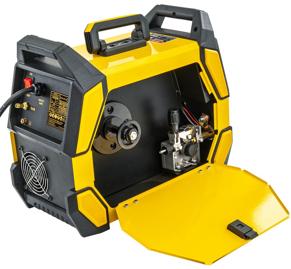 Urządzenie wyposażone jest w czytelny panel sterowania z podwójnym wyświetlaczem LCD, który pozwala na wygodne dostosowanie parametrów spawania do rodzaju wykonywanej pracy. Ergonomiczne pokrętła umożliwiają szybką zmianę ustawień, co ułatwia obsługę zarówno początkującym, jak i doświadczonym użytkownikom.