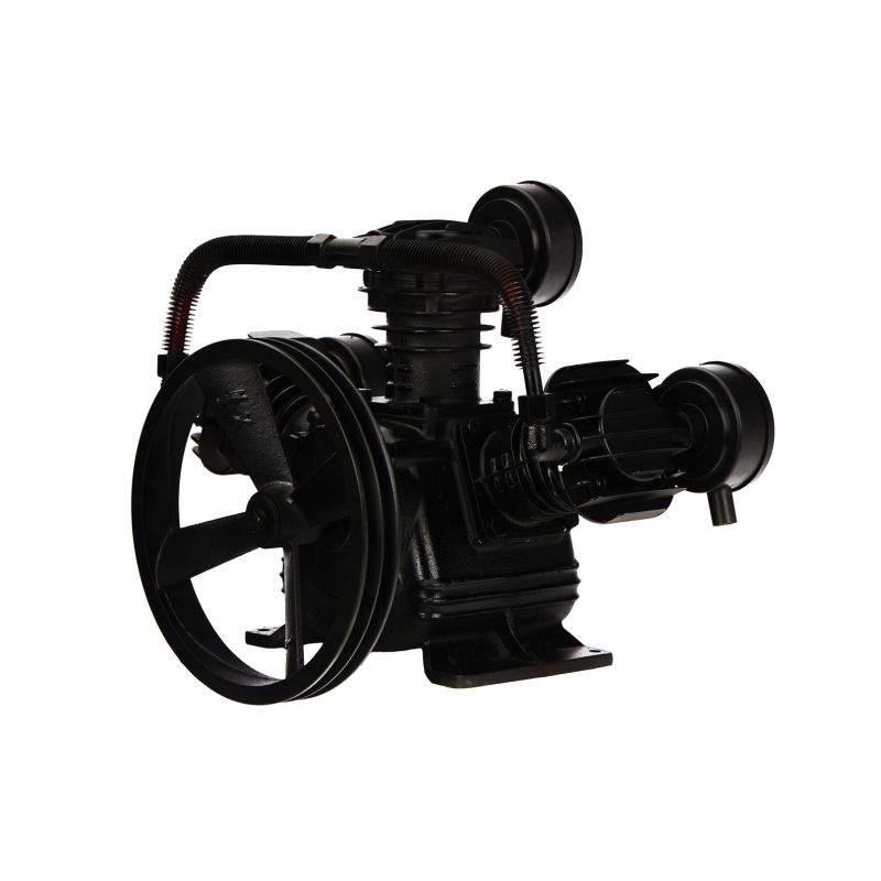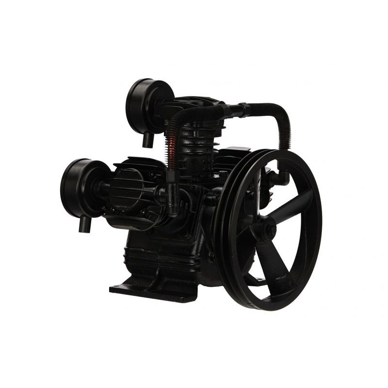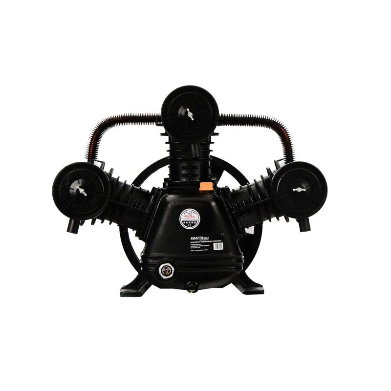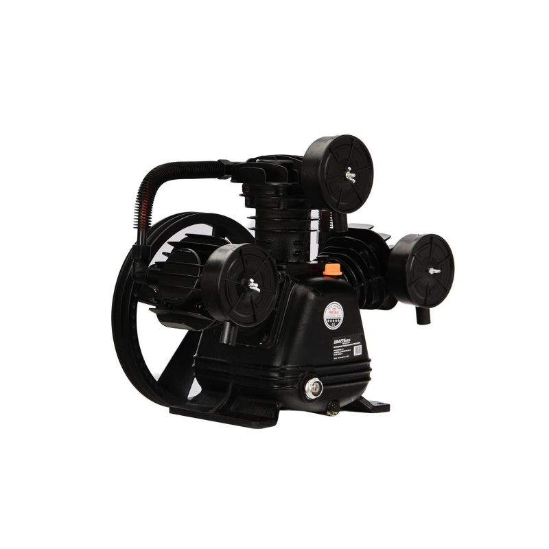 Sprężarka powietrza dwutłokowa W-0.9/8 polskiej marki Kraft&Dele, smarowana olejem, wyposażona w koło pasowe, które jednocześnie chłodzi kompresor oraz boczną chłodnicę powietrza.