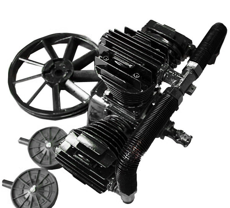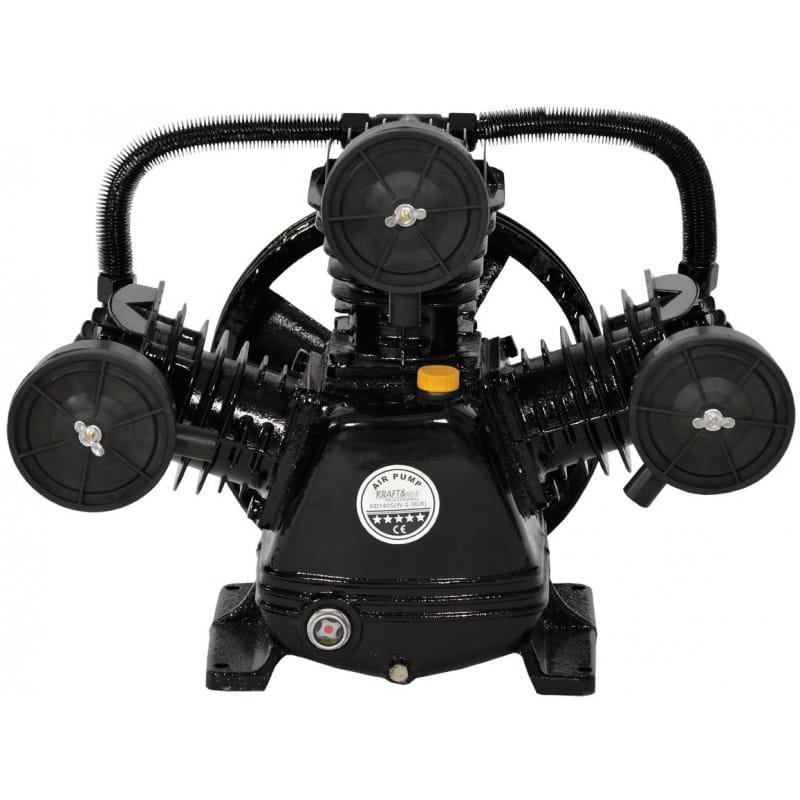 Sprężarka powietrza trzytłokowa W-0.67/8 polskiej marki Kraft&Dele, smarowana olejem, wyposażona w koło pasowe, które jednocześnie chłodzi kompresor oraz boczną chłodnicę powietrza.