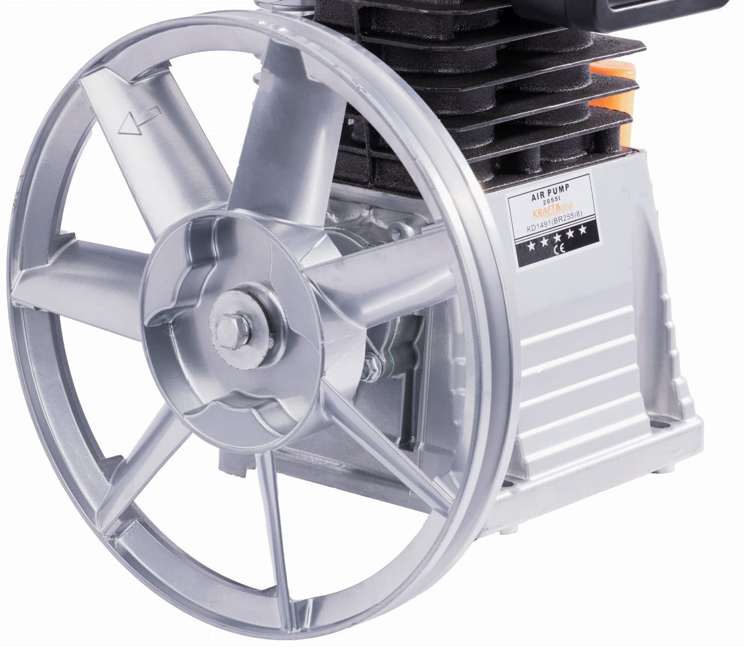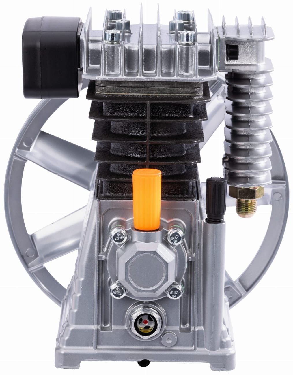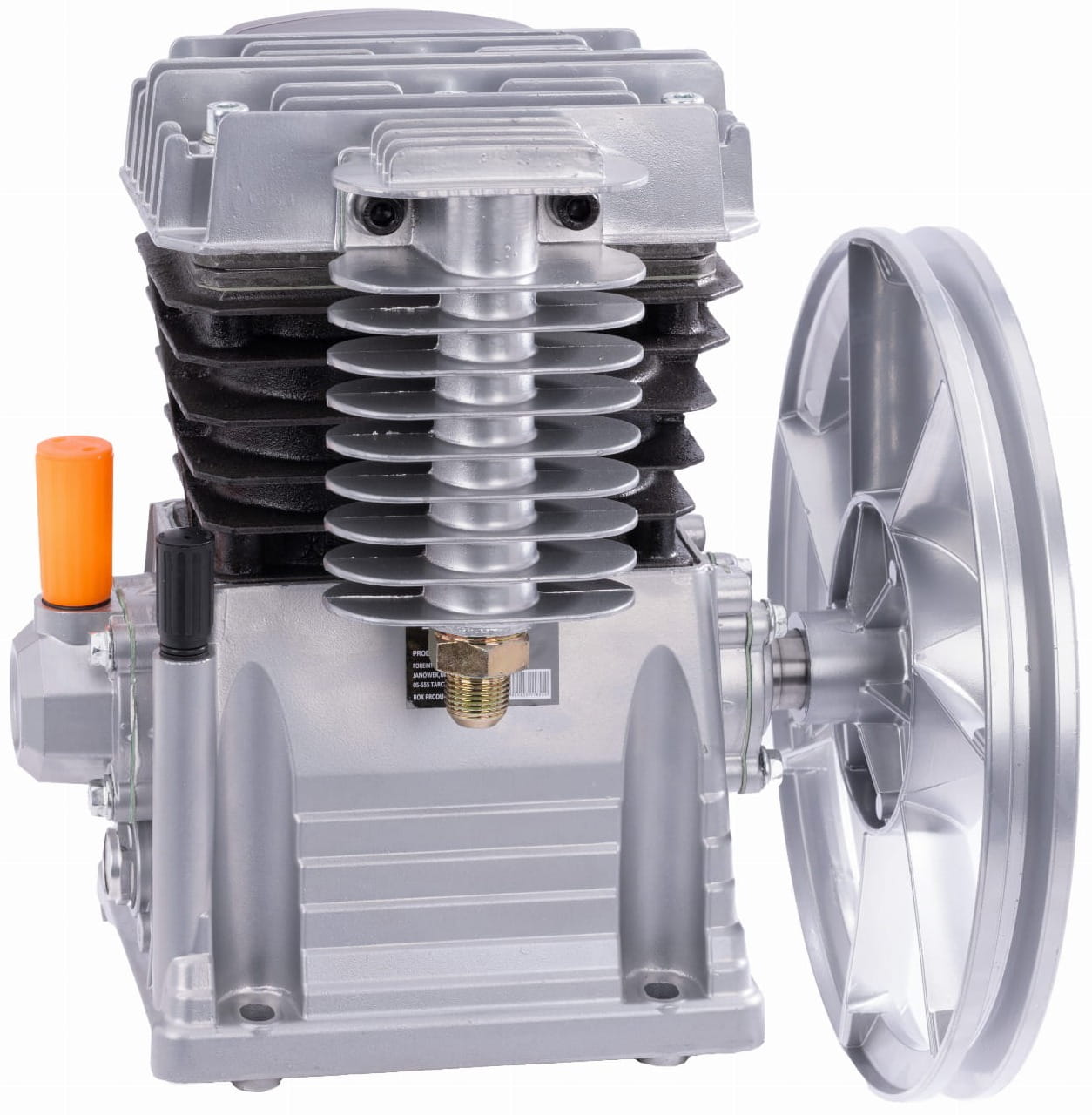 Dwucylindrowa budowa zapewnia równomierne tłoczenie powietrza oraz stabilne parametry pracy. Zastosowanie wytrzymałych materiałów konstrukcyjnych, takich jak aluminium i żeliwo, wpływa na trwałość urządzenia oraz jego odporność na intensywne użytkowanie. Dzięki przemyślanej konstrukcji sprężarka może stanowić element większego układu pneumatycznego lub pracować jako podstawowa pompa powietrza w kompresorze.