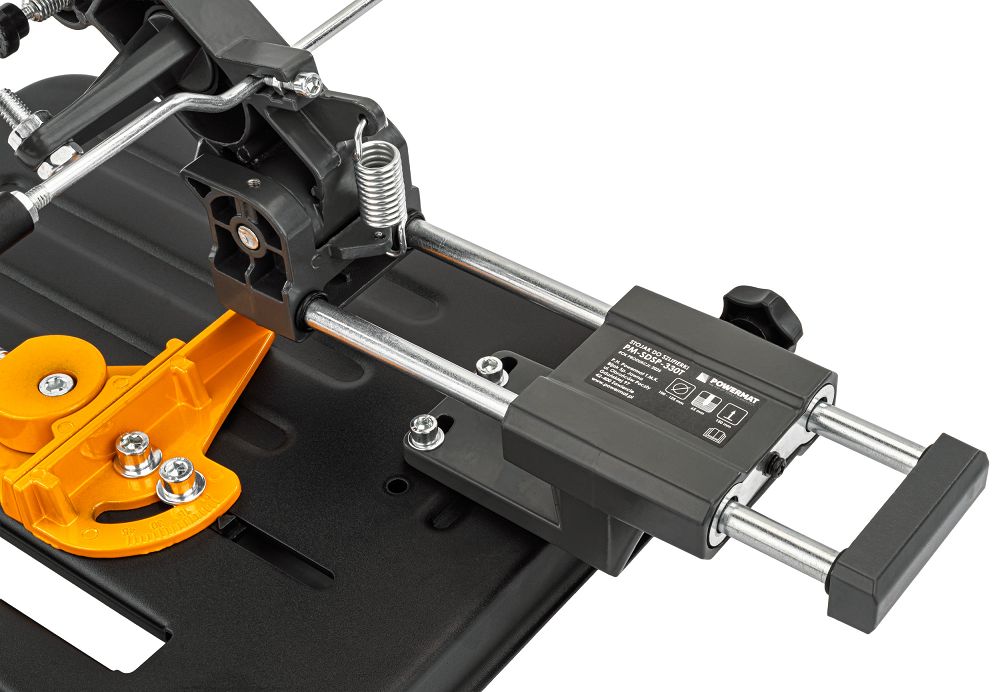 Prowadnica pracuje na dwóch metalowych prętach z łożyskami ślizgowymi, co eliminuje luzy i zapewnia lekki, stabilny ruch. Użytkownik otrzymuje płynność prowadzenia, która przekłada się na komfort i jakość cięcia.