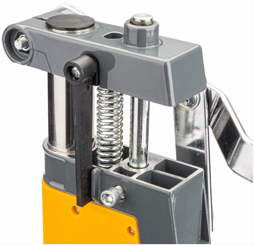 Korpus wykonany z aluminium zapewnia optymalne połączenie lekkości i wytrzymałości. Stabilna podstawa z otworami montażowymi umożliwia trwałe przymocowanie do blatu roboczego, co dodatkowo zwiększa bezpieczeństwo i komfort użytkowania. Dźwignia sterująca została zaprojektowana w sposób umożliwiający wygodne operowanie urządzeniem nawet podczas dłuższej pracy.