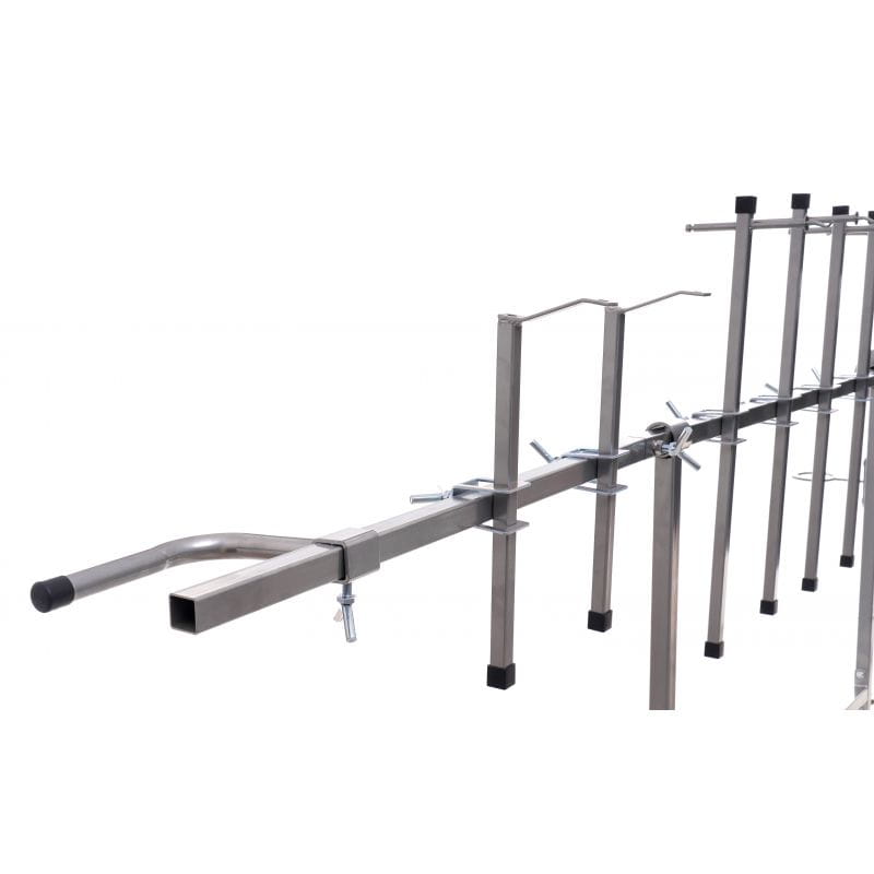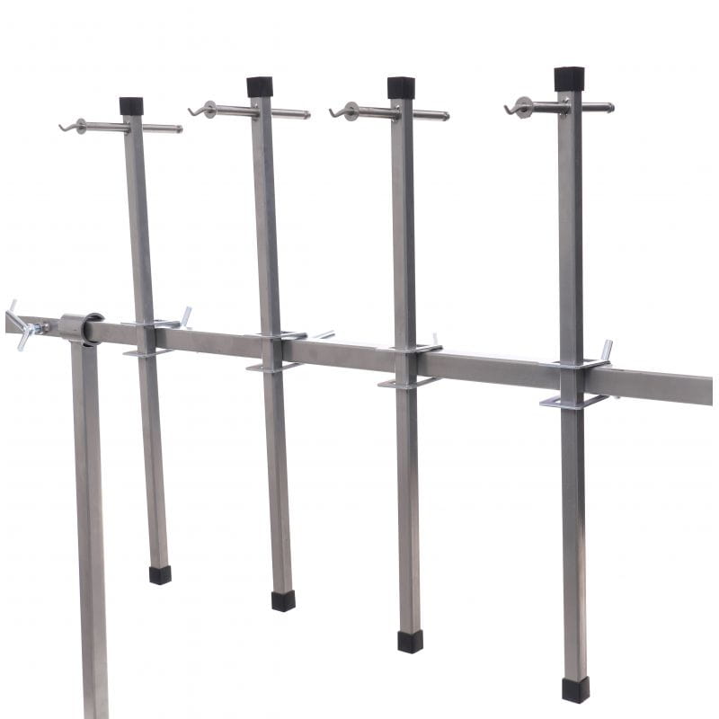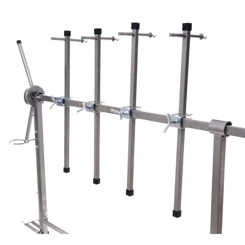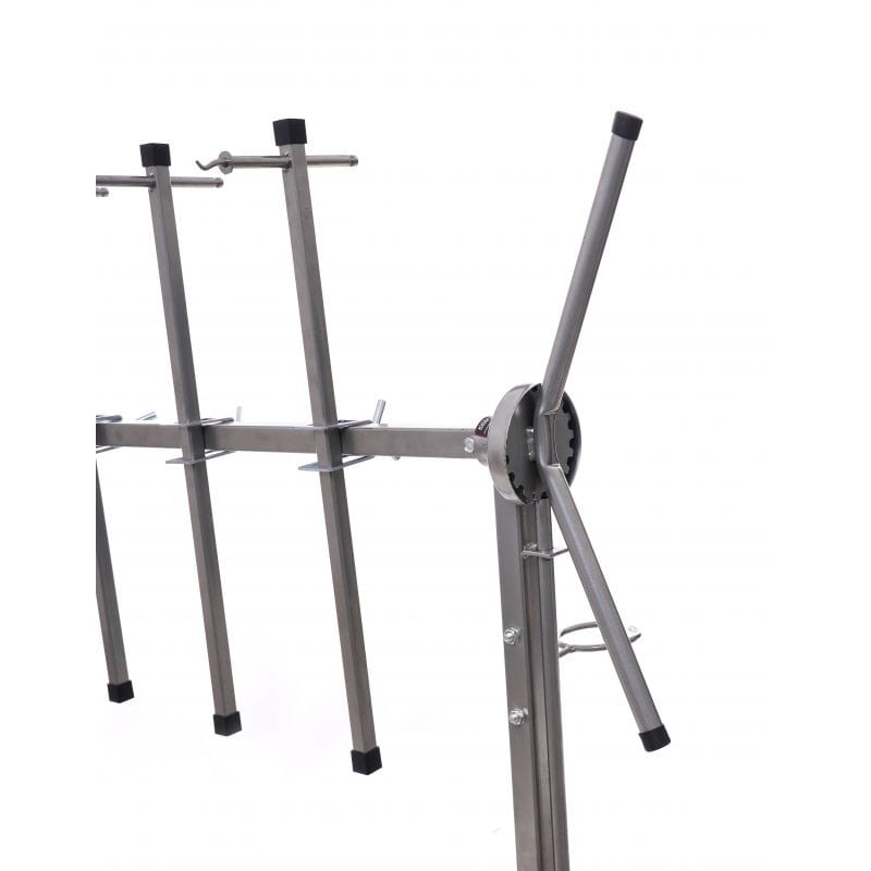 Stojak został wykonany z wytrzymałych materiałów, które gwarantują stabilność i trwałość podczas intensywnej eksploatacji. Wyposażony w sześć ramion, umożliwia pewne mocowanie malowanych elementów o różnych kształtach i rozmiarach. System obrotowy pozwala na płynną regulację położenia detalu w zakresie 360°, co ułatwia dostęp do wszystkich powierzchni bez konieczności jego przenoszenia.