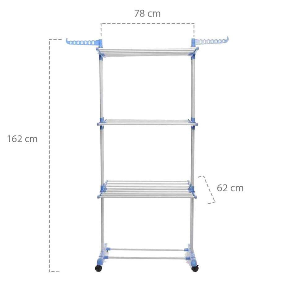 - Półki na trzech poziomach pozwalają na rozwieszenie ubrań całej rodziny. Duża suszarka na pranie posiada łącznie aż dwadzieścia cztery uchwyty na trzech poziomach.